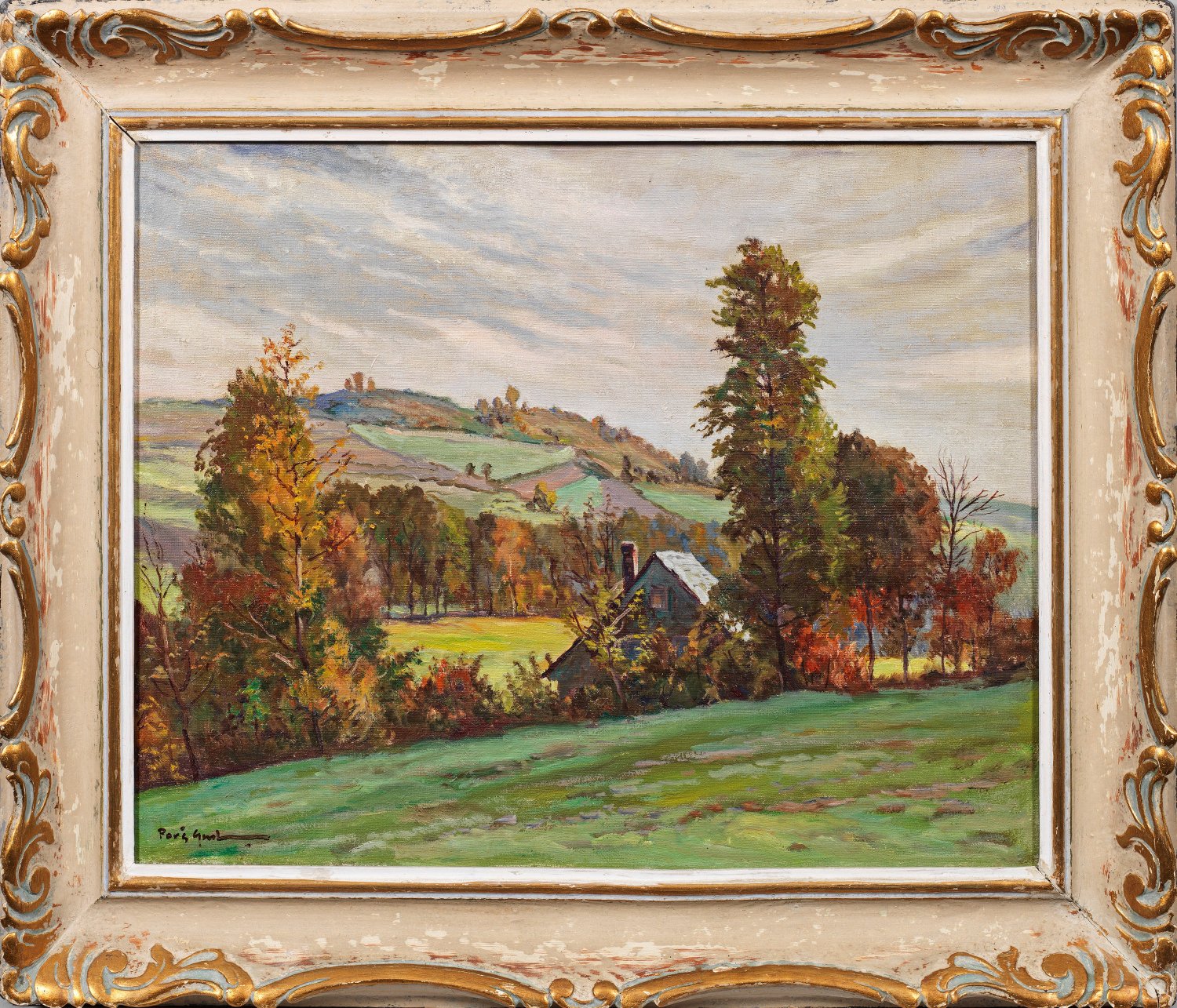 In sanfter hügeliger Landschaft, gemalt mit heiterem, leuchtendem Kolorit, ein kleines Haus zwischen Bäumen mit bereits farbenfroh herbstlich gefärbten Blättern. Pors, der an der Akademie in Prag studierte schuf ein umfangreiches Oeuvre mit stimmungsvollen Landschaftsansichten seiner tschechischen Heimat. Öl/Lwd.; L. u. sign.; 47 cm x 60 cm. Rahmen.