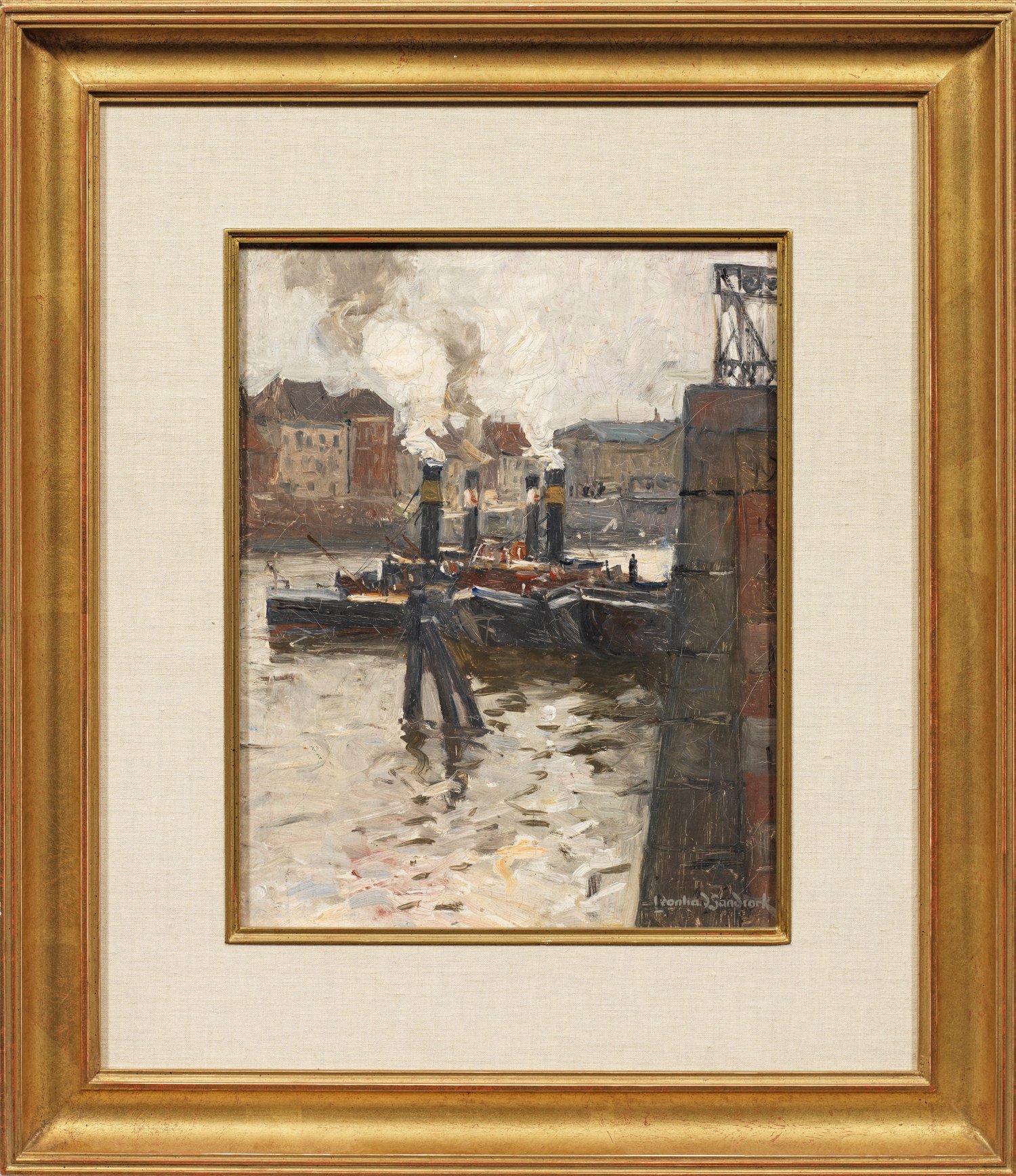 Impressionistisches, mit schnellem, breitem Duktus und weich-pastosem Farbauftrag gemaltes Werk Sandrocks aus einer Reihe von Hafendarstellungen, die norddeutsche Küstenstädte wie Bremen, Hamburg, Cuxhaven und Emden zeigen. Der von Hermann Eschke ausgebildete und von der Haager Schule beeinflusste Künstler widmete sich mit großer Leidenschaft der maritimen Thematik. Sandrock beschickte ab 1897 die Großen Berliner Kunstausstellungen, zunächst mit norddeutschen Hafenmotiven. 1912 rühmte Max Osborn ihn als "eins der stärksten und hoffnungsvollsten Talente der Berliner Malerzunft". Öl/Lwd., doubl.; L. u. sign.; Verso vom Künstler eigenhändig bez. u. betitelt mit Adresse in Berlin-Friedenau; drei Etiketten von Sandrock-Ausstellungen in Berlin, Bremerhaven und Wilhelmshaven, 1997/98. 33 cm x 26 cm. Rahmen.