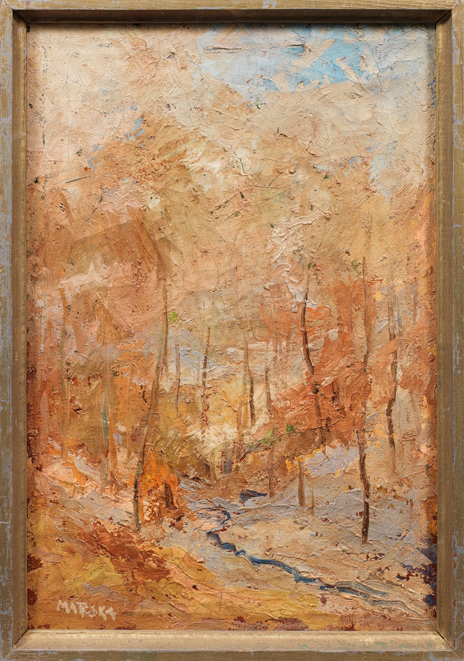 In pastelltonigem, erdigem Kolorit gemalte Landschaftsimpression mit kleinem Bachlauf, bei der Maticska die winterliche Stimmung in atmosphärischem Lichtspiel einfängt. Schon sehr früh erkannte Béla Iványi Grünwald das außergewöhnliche Talent Maticskas, der Schüler von Simon Hollósy war und 1902 - 1905 an der Kunstschule von Nagybánya lernte, weshalb Grünwald ihn 1904 zu Studienzwecken mit nach Rom nahm. Das nicht sehr umfangreiche Oeuvre des sehr jung verstorbenen Künstlers reicht von Bildnissen und Landschaften bis zu einigen wenigen Stillleben. Öl/Lwd.; L. u. sign. Craquelée. Ca. 55 cm x 38 cm. Rahmen.