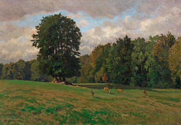 Impressionistisch aufgefasste Landschaft mit einem Sprung Rehe. Repräsentatives Werk des Künstlers, der durch seine lyrischen Landschaften zu einem Hauptvertreter der Karlsruher Malerschule wurde. Nach seinem Studium in Düsseldorf wurde er 1888-92 Meisterschüler bei Gustav Schönleber in Karlsruhe. Öl/Lwd.; L. u. sign. u. dat. 1905-1914. Verso Original-Etikett mit Künstler-Bez., Betitelung u. Ortsangabe Karlsruhe. 70 cm x 100 cm. Rahmen.