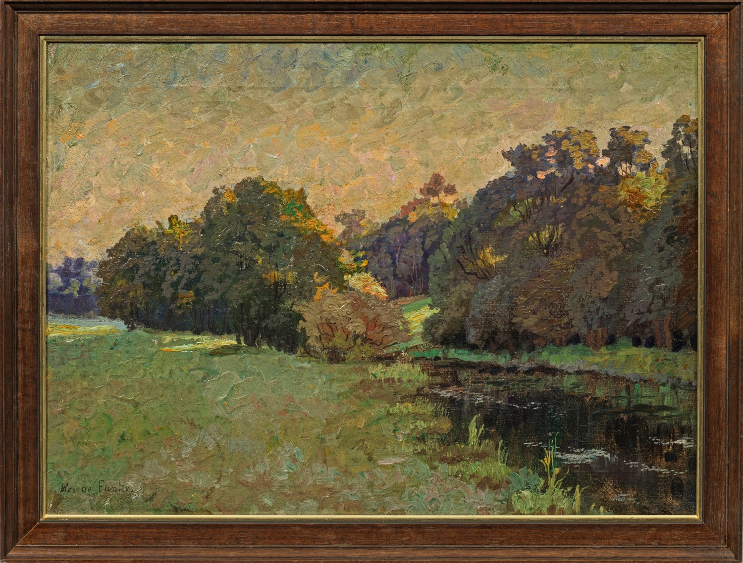 Frühe, impressionistische, mit weich-pastosem Farbauftrag gemalte Flusslandschaft der Künstlerin, die wahrscheinlich um 1900-1905 entstand, bevor sie zum Neoimpressionismus und später zum Expressionismus fand. Funke, Tochter einer Chemnitzer Industriellenfamilie, studierte ab 1899 Malerei an der Münchener "Damenakademie". 1904 debütierte Funke in der Großen Berliner Kunstausstellung mit der vergleichbaren Landschaft "Am Pappelbach". Um 1906 bis 1911 (oder 1913) hielt sie sich in Paris, Südfrankreich und Florenz auf. Während dieser Zeit wurde sie zu einer, auch von den meisten Kunstkritikern, geachteten Malerin. Mehrfach beschickte sie den Salon des Indépendants in Paris, 1908 zeigte sie in der Galerie Hermes in Frankfurt/M. 30 Werke, 1910 beteiligte sie sich an der Ausstellung der Dresdener Künstlervereinigung. 1911 oder 1913 siedelte sie nach Wien über, wo sie bis zu ihrem Tod lebte. Bereits 1911/12 nahm sie an Ausstellungen der "Vereinigung bildender Künstlerinnen Österreichs" im Hagenbund teil, als "österreichische" Künstlerin 1912 im Nationalsalon in Budapest. 1918 wurde sie Mitglied der Wiener Künstlergruppe "Bewegung", 1928 erhielt sie den Österreichischen Staatspreis. 1957 starb Funke verarmt in ihrer Wiener Wohnung und erhielt ein Ehrengrab auf dem Wiener Zentralfriedhof. Lange vergessen, gehört sie jedoch seit 1998 zu den großen Wiederentdeckungen unter den bedeutenden Künstlerinnen der Moderne. 2007 gab es eine Retrospektive im Lentos Kunstmuseum in Linz, 2018 in den Kunstsammlungen Chemnitz; 2019 waren Hauptwerke in der Ausstellung "Stadt der Frauen" im Belvedere in Wien zu sehen. Öl/Lwd.; L. u. sign.; Verso auf Original-Etikett betitelt u. mit "Nr. X" bez.; 46 cm x 64 cm. Rahmen.