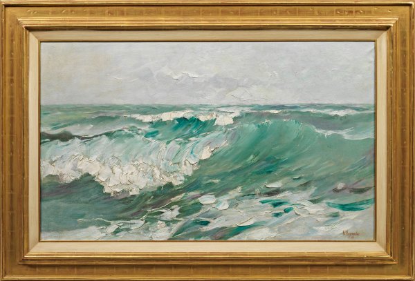 Das 1913 entstandene Werk ist nicht nur aufgrund seiner Dimensionen eines der großartigen Wellenbilder Hagemeisters, der als Freilichtmaler zu den eigenständigsten und zugleich modernsten deutschen Impressionisten gehört. 1907/08 bis 1915 verbrachte Hagemeister in Lohme auf Rügen regelmäßig den Sommer, wo seine Wellenbilder entstanden - meist in ähnlich großem Maßstab und in starker Nahsicht. Doch gleicht keines wirklich dem anderen. Mit schnellem, breitem, wuchtvollem Duktus und oft gespachteltem, dick-pastosem Farbauftrag fing er die Gischt der sich brechenden Wellen in der Brandung und im Sturm sowie die Allgewalt des Meeres ein. 1924 beschrieb sein Malerkollege Emil Thoma eindringlich die Entstehung dieser Bilder auf Rügen und die Intentionen Hagemeisters: "Dort fühlte er das Walten der Naturkräfte am elementarsten, und ihre Darstellung wurde nun zum Inhalt seiner Bilder. Er sagt selbst: 'Ich war gezwungen, die Naturdinge dort oben neu und gründlich zu studieren (...) Dann malte ich diese Dinge, das Wasser in seiner Durchsichtigkeit und verschiedenen Bewegungsgraden. Die gesetzmäßige Wirkung der Strömung auf den Flächen (...) Die wichtigsten Erscheinungsformen der Dinge sind die, die sie unter den meisten Bedingungen zeigen. Das ist bei der See die Brandung - deren Donner man selbst bei Nacht hört, wenn man nichts sieht. (Alle andere Seemalerei ist Seestillleben.) In diesem Sinne malte ich die größten Stücke, alle auf einen Sitz in zwei bis drei Stunden, die Küstenbilder ebenso!' "(in "Die Kunst für Alle", Jg. 1924/25, S. 78). Kurz zuvor, 1923, wurde Hagemeister auf Initiative von Liebermann als ordentliches Mitglied in die Akademie der Künste aufgenommen; zugleich richtete der Museumsdirektor der Berliner Nationalgalerie Ludwig Justi anlässlich des 75. Geburtstages von Hagemeister 1923 eine große Einzelausstellung aus - der größte Saal der Nationalgalerie blieb den Wellenbildern vorbehalten. Zu den bedeutenden Museen, die heute größere Werkgruppen seiner Wellenbilder besitzen, gehören außer der Nationalgalerie das Bröhan-Museum in Berlin. Öl/Lwd.; R. u. sign. u. dat. 1913. Verso auf dem Keilrahmen altes Etikett "Kunstsalon Abels Köln Hohenstaufenring 57". 76 cm x 129 cm. Rahmen.