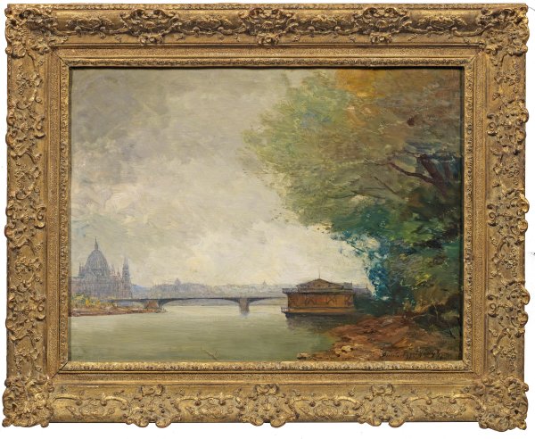 Blick von Norden über die Donau auf das 1885-1904 errichtete, neogotische Parlamentsgebäude. Impressionistische, mit nuanciertem, weichem, teilw. virtuos lockerem und breitem Duktus gemalte Vedute der Hauptstadt Ungarns. Öl/Lwd.; R. u. dat. 1897 mit Ortsangabe "B(uda)pest" u. "Hungary". 61 cm x 80 cm. Rahmen.