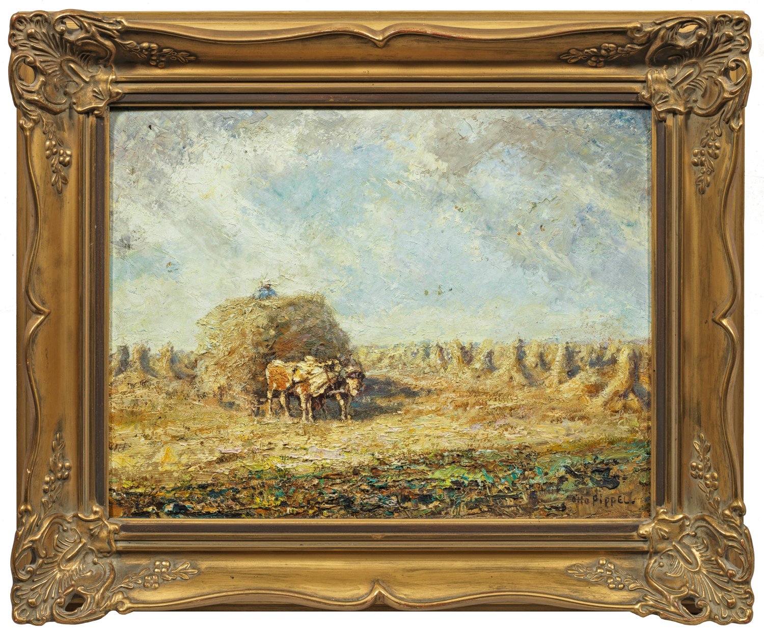 Oil on canvas. Signed. Sketch of a peasant working a field with cattle on the reverse, studio label of the artist. Minor losses of colour and staining in some areas.