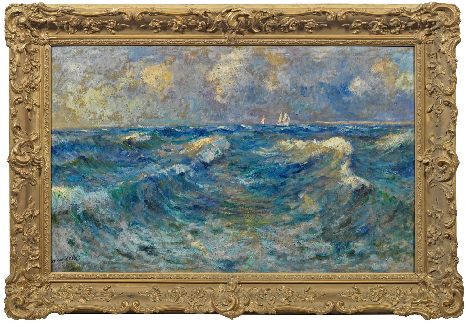 Impressionistisches Seestück Tarnogrockis, der zur Künstlerkolonie in Schwaan gehörte. Der Maler studierte seit 1893 an der Kgl. Kunstschule in Berlin, 1894 wechselte er an die Kunstschule Weimar zu Franz Bunke. Dieser fuhr mit ihm und weiteren Schülern mehrmals in das mecklenburgische Schwaan, wo sich Ende des 19. Jh. eine Künstlerkolonie entwickelt hatte. Seine künstlerische Ausbildung vollendete Tarnogrocki an der Kunstakademie in Stuttgart bei Carlos Grethe und in Paris an der Académie Colarossi. 1905 wurde der Künstler in Stettin ansässig, doch blieb er in Verbindung zu den Schwaaner Malern. Ein großer Teil seines Oeuvres ging im II. Weltkrieg verloren, die wenigen erhaltenen Werke zeigen ein beachtliches künstlerisches Niveau sowie dass er außer Landschaften insbesondere Stadtansichten und Hafenmotive in Mecklenburg-Vorpommern malte. Öl/Lwd.; L. u. sign.; 75 cm x 125,5 cm. Wohl Original-Rahmen.