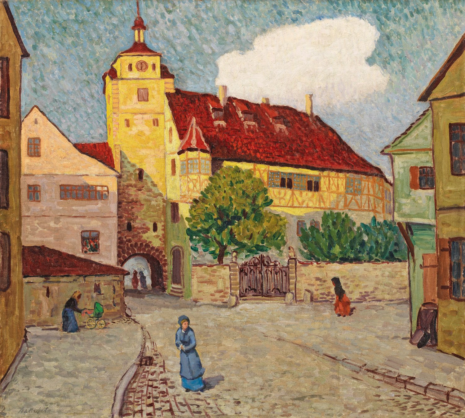 Blick von der Gagengasse auf den mittelalterlichen Weißen Turm. Durch eine Staffage aus weiblichen Figuren belebte, in teilw. leuchtendem Kolorit gemalte Stadtvedute des von den französischen Impressionisten und Matisse beeinflussten ungarisch-rumänischen Malers, entstanden um 1911. Béla Balla lernte 1904/05 in der Malschule von Károly Ferenczy in der Künstlerkolonie in Nagybánya und studierte danach in München. Hierdurch dürfte er auch das pittoreske Rothenburg kennengelernt haben. Die Entstehungszeit um 1911 für dies Gemälde wird dadurch fundiert, dass eine datierte, winterliche Rothenburg-Ansicht Ballas aus diesem Jahr dokumentiert ist. Später kehrte er in seine Heimatstadt Arad zurück, 1927 schloss er sich wieder der Künstlerkolonie von Nagybánya an. Seine Werke befinden sich in der Nationalgalerie von Ungarn und in mehreren öffentlichen Sammlungen in Ungarn und Siebenbürgen. Öl/Lwd.; L. u. sign.; Verso nochmals sign.; Eine kleine Läsur in der Lwd.; 90,5 cm x 101 cm.
