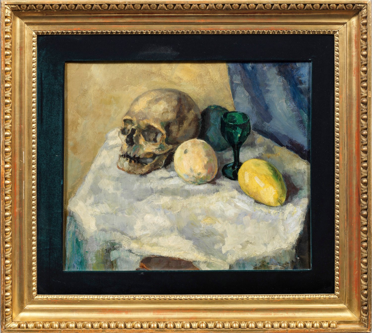 Das Stillleben spiegelt in Motiv, Stil, Behandlung des Lichts und Kolorits die intensive Auseinandersetzung des Künstlers mit Paul Cézanne wider, wie ein Vergleich mit dessem berühmten, 1890-1893 geschaffenen Gemälde "Still Life with Skull" ("Nature morte au crâne"; Barnes Foundation, Philadelphia) zeigt. Sluijters, der zu den bedeutenden niederländischen Künstlerpersönlichkeiten der Moderne gehört, studierte ab 1901 zusammen mit dem befreundeten Leo Gestel an der Amsterdamer Akademie und gewann 1904 den mit einem vierjährigen Auslandsstipendium verbundenen Prix de Rome. Bei seinen Reisen nach Paris lernte Sluijters auch die Werke der Impressionisten, Kubisten und Fauvisten kennen, war von Vincent van Gogh, Paul Cézanne, André Derain und Maurice de Vlaminck fasziniert. Seine neu entstandenen Gemälde waren der Jury des Prix de Rome zu modern, so dass sie ihm sein Stipendium entzog. Schon ab 1909 stieg dennoch der Bekanntheitsgrad Sluijters, 1910 gründete er mit Piet Mondrian in Amsterdam eine neue Künstlergenossenschaft; auch in Deutschland wurde er mit Mondrian als talentvoller junger Künstler gerühmt, seine Werke besprochen und in den renommierten Kunstzeitschriften publiziert. In den Jahren 1917 und 1920 wurde er Mitglied der Haager Künstlervereinigung Pulchri Studio und der Amsterdamer Künstlervereinigung Arti et Amicitiae. 1927, 1941 und 1951 zeigte das Stedelijk Museum in Amsterdam große Ausstellungen und Retrospektiven. Sein internationales Renommee drückt sich im Grand Prix der Weltausstellung 1937 in Paris aus. Zu den bedeutenden niederländischen Museen mit Werken des Künstlers gehören heute u. a. das Museum Boijmans Van Beuningen in Rotterdam sowie das Van Gogh Museum und Rijksmuseum in Amsterdam. Öl/Lwd.; Sign.; 51 cm x 61 cm. Rahmen.