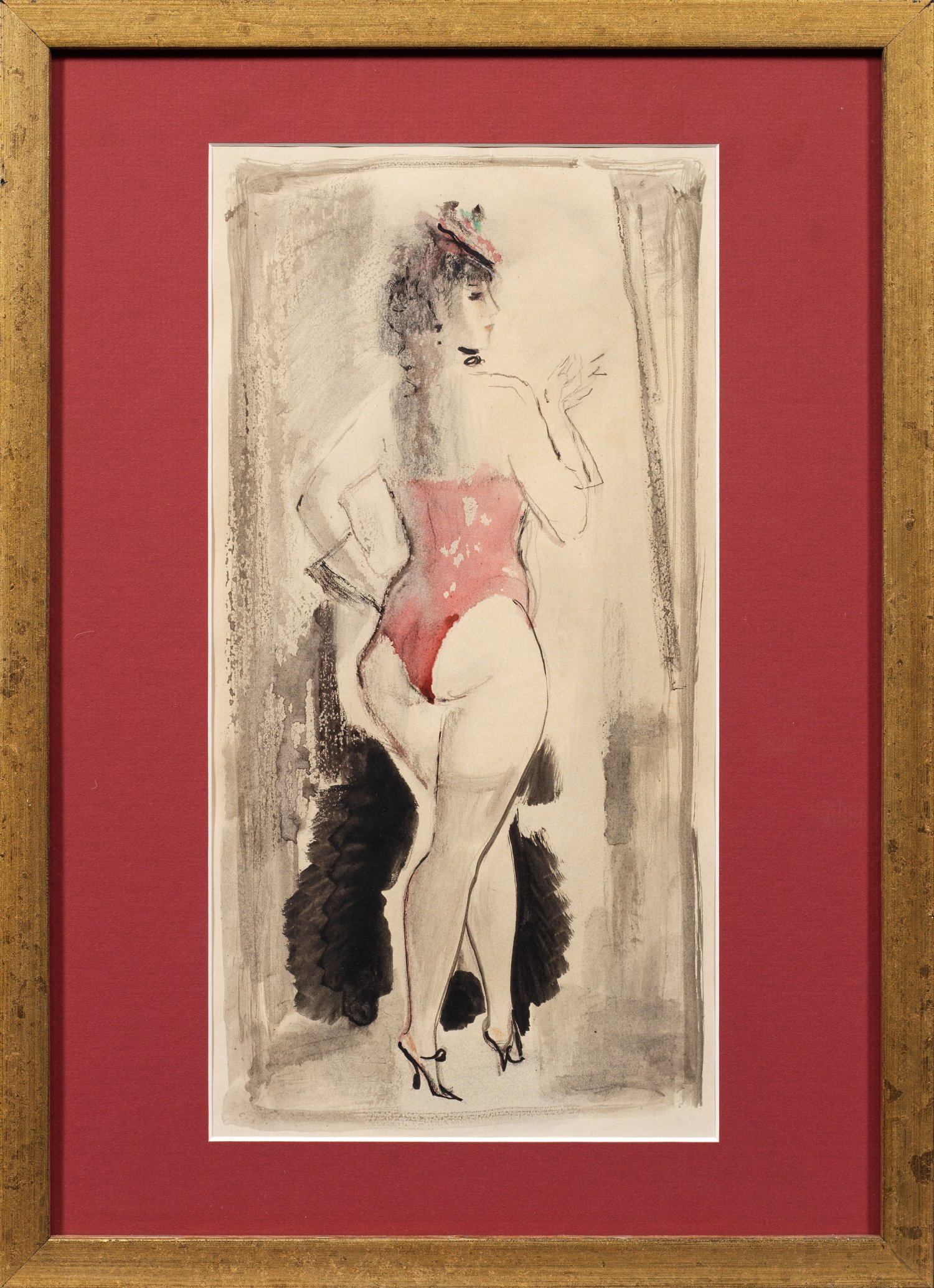 In Rückenansicht dargestellt eine leicht bekleidete Dame, in Sujet und Manier charakteristisches Blatt Rudakows, der an der Akademie in St. Petersburg studierte und als Grafiker, Zeichner und Illustrator ebenda tätig war. Mischtechnik/Papier. Verso schwer leserl m. Bleistift bez.; Ger. Läsuren. Darstellung 37,5 cm x 19,5 cm (Passepartoutausschnitt). Blatt ca. 39,3 cm x 23,8 cm. Rahmen.