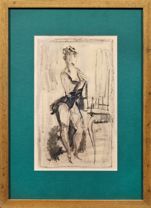 In der Hand eine Zigarette haltend blickt die leicht bekleidete Dame in ihren Schminkspiegel, ein in Sujet und Manier charakteristisches Blatt Rudakows, der an der St. Petersburger Akademie studierte und als Grafiker, Zeichner und Illustrator ebenda tätig war. Mischtechnik/Papier. Ger. Läsuren. Darstellung 31,5 cm x 19,5 cm (Passepartoutausschnitt). Blatt ca. 38,4 cm x 26,8 cm. Rahmen.