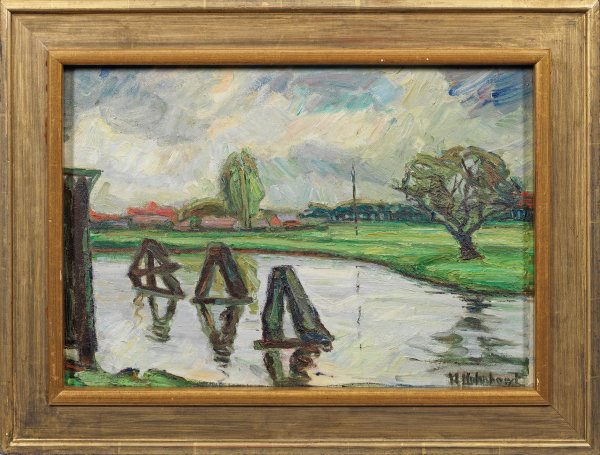 In breitem, lockerem Duktus gemalte Landschaft der überwiegend in Oldenburg tätigen Künstlerin, die Schülerin bei Julian Klein von Diephold aus Homburg v. d. Höhe und Gerhard Bakenhus war und an der Kunstgewerbeschule in Bremen studierte. Öl/Lwd., kaschiert auf Holzplatte. R. u. sign.; 46 cm x 65,8 cm. Rahmen.
