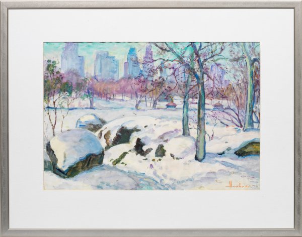 Impressionistische Landschaft des deutsch-amerikanischen Künstlers, dessen malerisches Oeuvre vornehmlich Motive aus New York und dem Allgäu umfasst. Aquarell u. Gouache/Papier. R. u. Sign.; 36,5 cm x 53,5 cm (Passepartout). Rahmen.