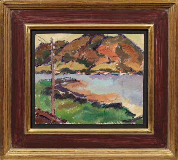 Von Paul Cézanne und den Künstlern des "Blauen Reiters" beeinflusste, spätimpressionistische Landschaft. Köhler-Roeber lernte 1906-1914 in der fortschrittlichen Malschule von Johannes Walter-Kurau in Dresden und der modernen Debschitz-Schule in München. Öl/Papier, auf Karton kaschiert. Verso Etikett mit Nachlass-Stempel u. Nr. 175 sowie Etikett der Retrospektive im Museum Zitadelle, Berlin-Spandau, 2020. Ca. 22 cm x 28 cm. Rahmen.