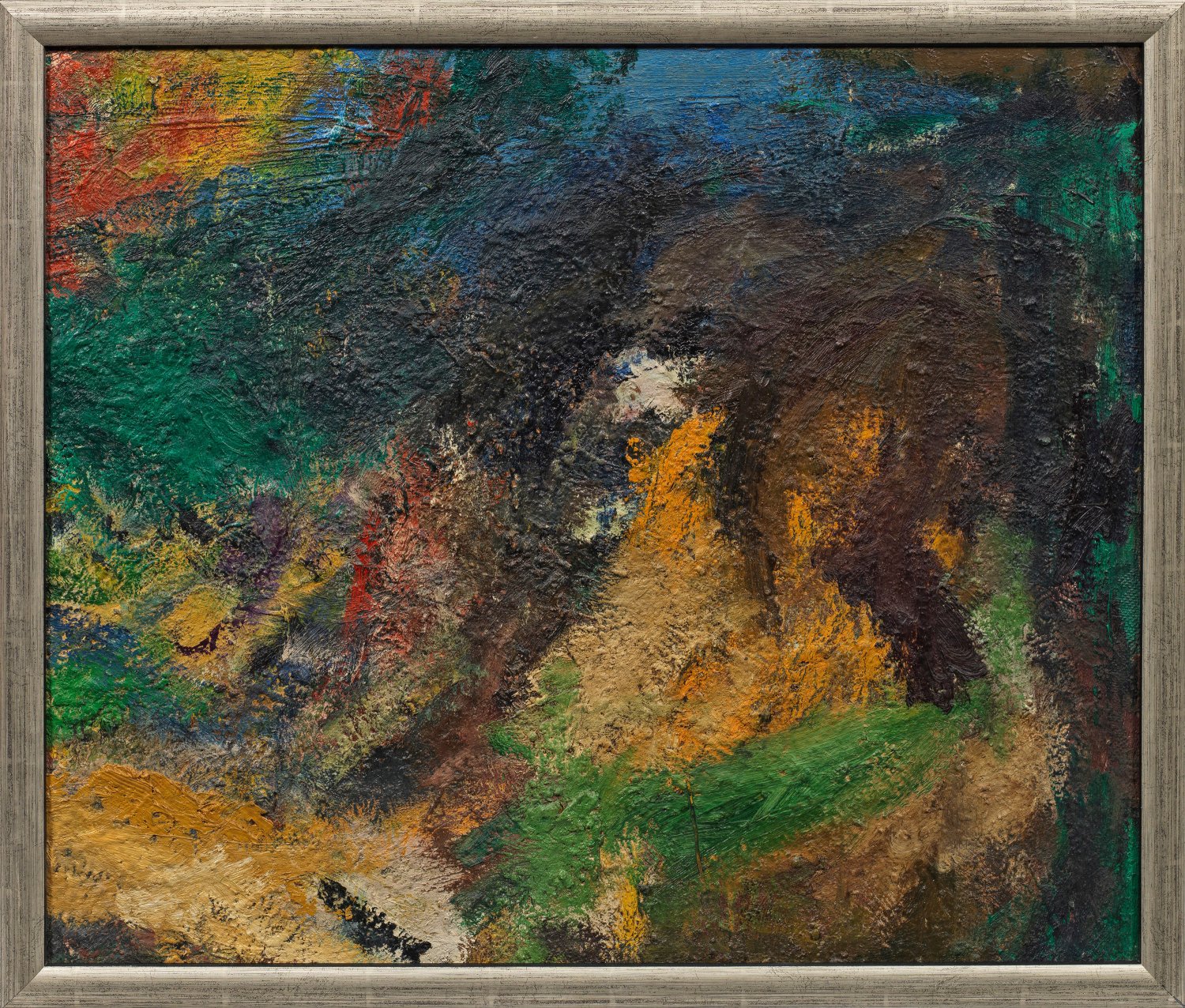 In leuchtend kräftigen Farben und ausdrucksstarkem, pastosem Duktus das abstrakte Gemälde ganz im Stile der späteren Werke Erich Kahns, dessen Oeuvre zunächst spätexpressionistisch geprägt war und ab den 1950er Jahren zunehmend abstrakter wurde. Aufgrund seiner jüdischen Herkunft emigrierte Kahn 1939 nach England, wo er sich nach dem Krieg dauerhaft niederließ. 1989 zeigte die John Denham Gallery in London eine große Retrospektive des Stuttgarter Künstlers. Öl/Masonitplatte; Verso betitelt (von fremder Hand?) sowie mit Etikett der Galerie John Denham London. 51 cm x 61 cm. Rahmen.