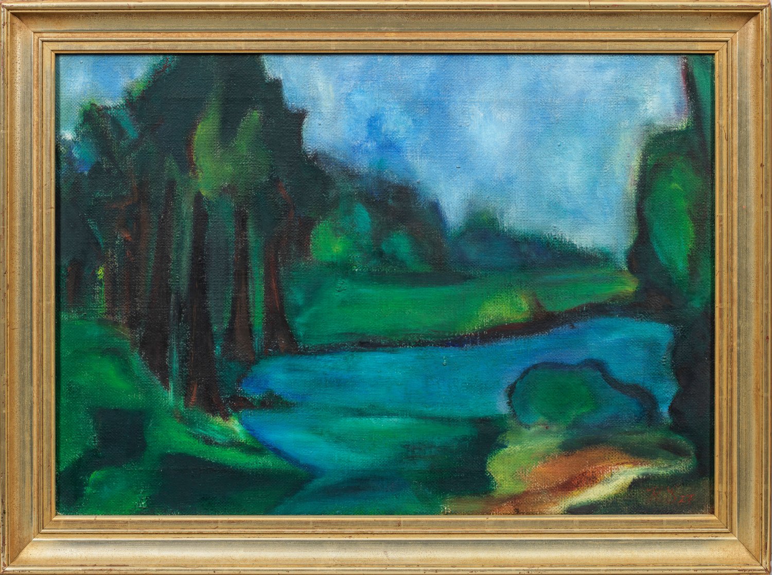 Expressionistische, großflächige Darstellung. Der später als Merzkünstler bekannte Schwitters studierte 1909-14 an der Akademie der Künste in Dresden bei Carl Bantzer, Gottfried Kuehl und Emanuel Hegenbarth. Aus Schwitters' Oeuvre vor seiner Hinwendung zum Futurismus, Kubismus und Dadaismus sind bisher nur relativ wenige Landschaften und Stillleben bekannt. Öl/Sackleinwand. R. u. monogr. "KS" u. dat. (19)17. Verso unvollendete Studie. Auf dem Keilrahmen bez. "I" sowie undeutl. Ortsangabe oder Betitelung "Teufelsbach b(...)". 47 cm x 68,5 cm. Rahmen.