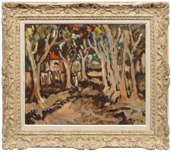 Mit großzügig furiosem Duktus, vorwiegend in tonigem Kolorit und Schwarz gemalte Darstellung, die durch einzelne Farbakzente in Rot, Blau, Ockergelb und Grün belebt wird und die einzelnen Bildelemente miteinander zu einem Ganzen verwebt. Öl/Holztafel. R. u. undeutl. sign.; 46 cm x 55 cm. Rahmen.