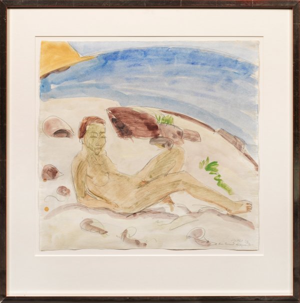 Expressionistische, wohl bei Osterholz an der Flensburger Förde entstandene Strandszene mit ruhendem weiblichem Akt, entstanden 1923. Badende gehörten zu den Leitmotiven Heckels, seit er als "Brücke"-Mitglied diese 1909/10 an den Moritzburger Seen malte. 1913 besuchte Heckel erstmals das Dorf Osterholz; 1919 erwarb er dort ein Bauernhaus über der Steilküste und baute sich im Dach einen Atelierraum. Danach wurde Osterholz fortan zu seiner sommerlichen Residenz: "Zudem muß die einsame Strandlandschaft um Osterholz mit dem steilabfallenden, zerklüfteten Ufer, mit den sanft geschwungenen Buchten und dem bewaldeten Höhenstreifen längs des Ufers den Künstler immer wieder bezaubert haben (...) Keine andere Landschaft bot außerdem eine glücklichere Gelegenheit (...) Natur und Mensch weiterhin als eine Einheit zu erleben" (Zit. Paul Vogt: "Erich Heckel", Recklinghausen, 1965, S. 64 f.). 1923 weilte auch der befreundete Künstlerkollege Otto Mueller für einige Wochen in Osterholz; als sog. "Sommerkinder" verbrachten überdies alljährlich Söhne und Töchter von Heckels Schwester oder von Freunden dort ihre Ferien und bereicherten die Strandszenen. Seine Farbpalette hellte sich im Laufe zusehends auf. In der NS-Zeit verdunkelte sich aber nicht nur die allgemeine Politik, auch die Kunstpolitik wurde zunehmend rigider: 1937 verhängte man über Heckel - wie über viele andere Vertreter der Moderne - ein Ausstellungsverbot; im Rahmen einer staatlichen "Säuberungsaktion" wurden 746 Arbeiten aus deutschen Museen entfernt; 15 seiner Werke stellte man in der propagandistischen Wanderausstellung "Entartete Kunst" an den Pranger. 1939 gab Heckel sein Osterholzer Atelier auf. Aquarell u. Bleistift/Bütten. R. u. sign., dat. (19)23 u. betitelt. Vereinzelte winzige Braunfleckchen, ein ger. Fleck am linken Rand, Blattkanten mit minim. Quetschfalten, verso an den Ecken mit Montierungsspuren, sonst insgesamt in guter Erhaltung. Ca. 53,5 x 56,5 cm. Rahmen.
