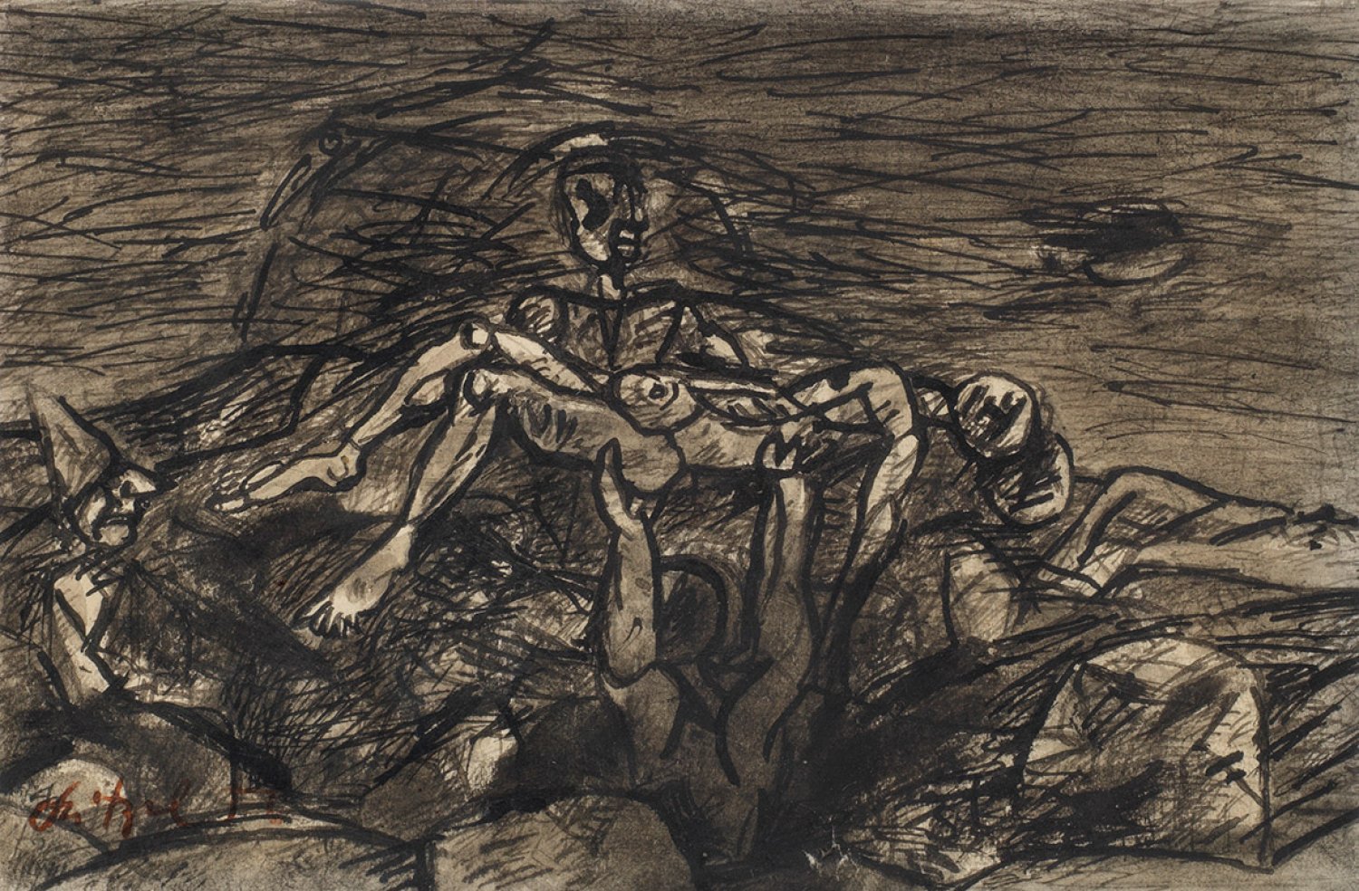 Expressionistische Arbeit Kitzels, der in der DDR und der Bundesrepublik zu den bedeutenden Künstlerpersönlichkeiten nach 1945 gehörte. Kitzel studierte 1945 - 1950 an der Kunstschule Burg Giebichenstein in Halle. Befreundet mit Kurt Bunge, Albert Ebert, Gertraud und Otto Möhwald, gehörte Kitzel neben seinen Malerkollegen Charles Crodel, Erwin Hahs und Ulrich Knipsel zu den Malern, die in den 1950er Jahren der offiziellen Kunstdoktrin in der DDR entgegenwirkten. 1956 zeigte die Galerie Henning in Halle die erste Einzelausstellung. 1957 wurde Kitzel als Lehrer an die Staatliche Akademie der Bildenden Künste Karlsruhe berufen, 1962 erhielt Kitzel eine Professur. Feder u. Tusche/Papier. L. u. sign.; 12,3 cm x 18,5 cm. Rahmen.
