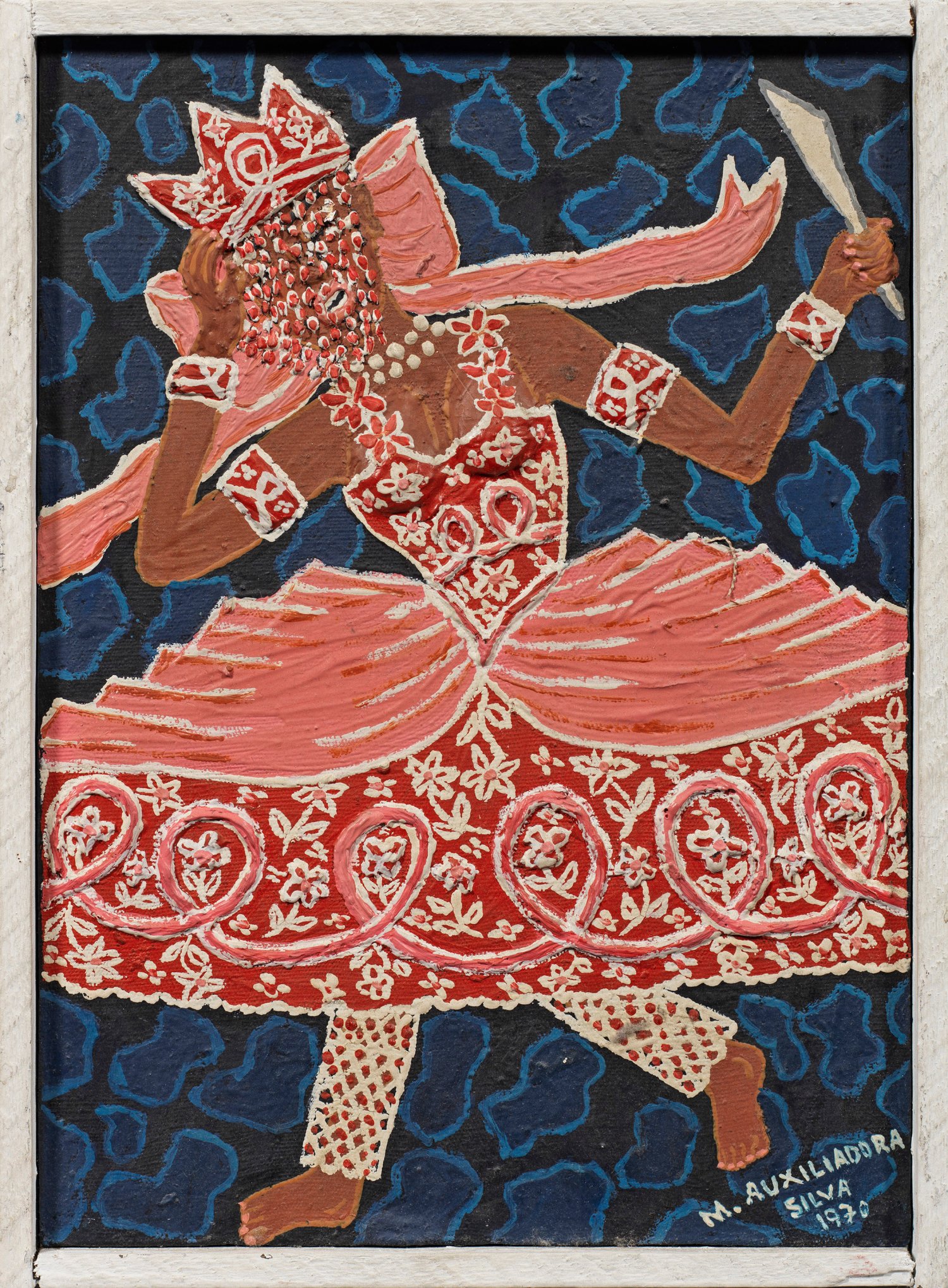 Auxiliadora da Silva, die sich autodidaktisch bildete, experimentierte schon früh mit Texturen und kam so zu einer einzigartigen Bildsprache, indem sie Acrylfarbe in kräftigen Farben äußerst pastos und unter Verwendung von beigemischten Hilfmitteln wie u.a. Gips reliefartig auftrug und damit einen Hybridismus zwischen Malerei und Relief schuf. Mischtechnik/Lwd.; R. u. sign. und dat. 1970. Verso sign. und bez.; 24 cm x 33 cm. Rahmen.