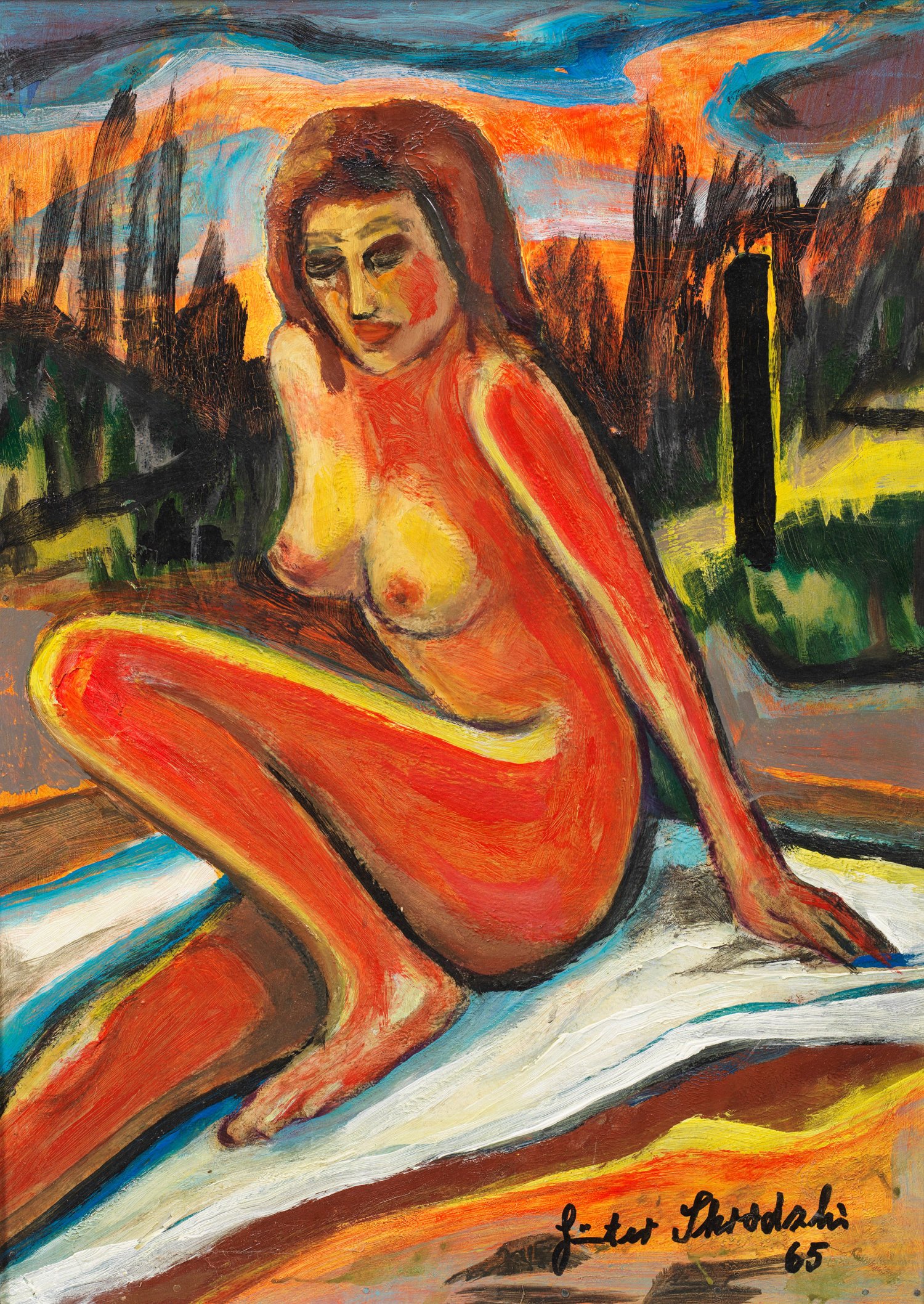 In expressivem Duktus und leuchtend grellen Farben setzt Skrodzki den weiblichen Akt in eine grob skizzierte Landschaft. Ein im Stil charakteristisches Werk des norddeutschen Künstlers, der zunächst eine Ausbildung zum Gebrauchsgrafiker in uisburg und anschließend in Malerei und Grafik absolvierte. Öl/Masonitplatte. R. u. sign. und dat. (19)65. Ca. 70 cm x 50 cm. Rahmen.