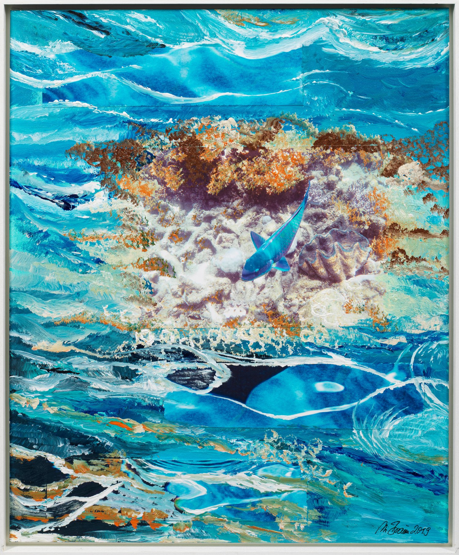 In ein farbenfrohes und dynamisches Wellenspiel mit Schaumkronen arbeitet Braun Fische und deren Lebensraum ein. Neben Werkzyklen von Fotoeditionen befasst sich Braun mit Fotocollagen in Verbindung mit Acrylmalerei, welche die räumlich-künstlerischen Grenzen der Fotografie erweitern. Mischtechnik mit Collage/Lwd., kaschiert auf festen Karton; R. u. sign. und dat. 2019; Verso handschriftlich und auf einem Galerieetikett (orts-)bez., betitelt und dat. 60 cm x 50 cm. Rahmen.