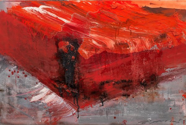 In äußerst kraftvollem, teils stark pastosem Duktus und glühender, rot-oranger Farbigkeit gesetzter, bildbestimmender Balken, der den Betrachter die gleißende Hitze einer frisch gegossenen Bramme assoziativ spüren lässt. Moser studierte 1968-1973 an der Wiener Akademie und eroberte sich seitdem durch eine Reihe von Auszeichnungen und zahlreiche Einzel- und Gruppenausstellungen einen Rang in der deutschen und österreichischen Kunstszene. Ihr Oeuvre steht in der Tradition des Informel und Abstrakten Expressionismus, zugleich spiegeln Arbeiten wie diese in abstrakter Form eigene Seheindrücke aus der väterlichen Schlossereiwerkstatt wider, mit denen sie aufwuchs - silbernes Metall, glühendes Feuer, rostendes Eisen und Ruß. Öl/Lwd.; R. u. sign.; Verso auf Galerieetikett betitelt und bez. 60 cm x 90 cm. Rahmen.