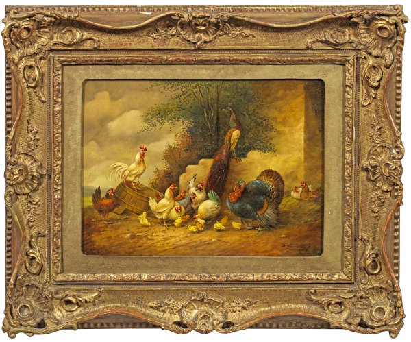 Farbenprächtige, fein gemalte Arbeit mit Hühnern, Hahn, Küken, Truthahn und Pfau des auf naturalistische Tierbilder - besonders auf Vögel - spezialisierten Künstlers. Öl/Holzplatte. R. u. sign. mit Ortsangabe München. 28,5 cm x 39 cm. Rahmen.