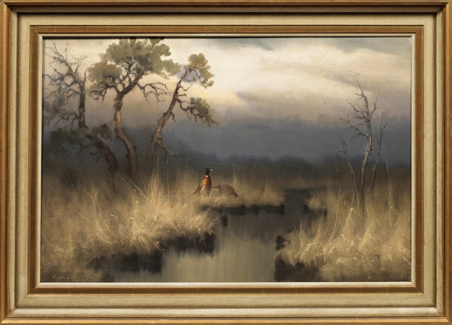 Unter dunklen Wolken die ruhig daliegende Moorlandschaft mit einem Fasananpaar ganz in der weichzeichnenden Manier der Werke von Manfred Schatz. Öl/Lwd.; L. u. schwer leserlich sign. "Seliger" (?). 60 cm x 89,5 cm. Rahmen.