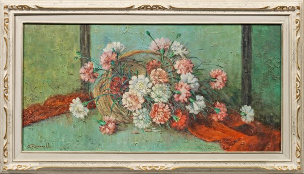 In lockerem und pastosem Duktus die weißen, roten und rosafarbenen Nelken in einem Korb, umschwungen von Draperie. Öl/Lwd.; L. u. sign.; Verso bet., dat. 1970 und sign.; Ger. Farbverluste. 50 cm x 100 cm. Rahmen.