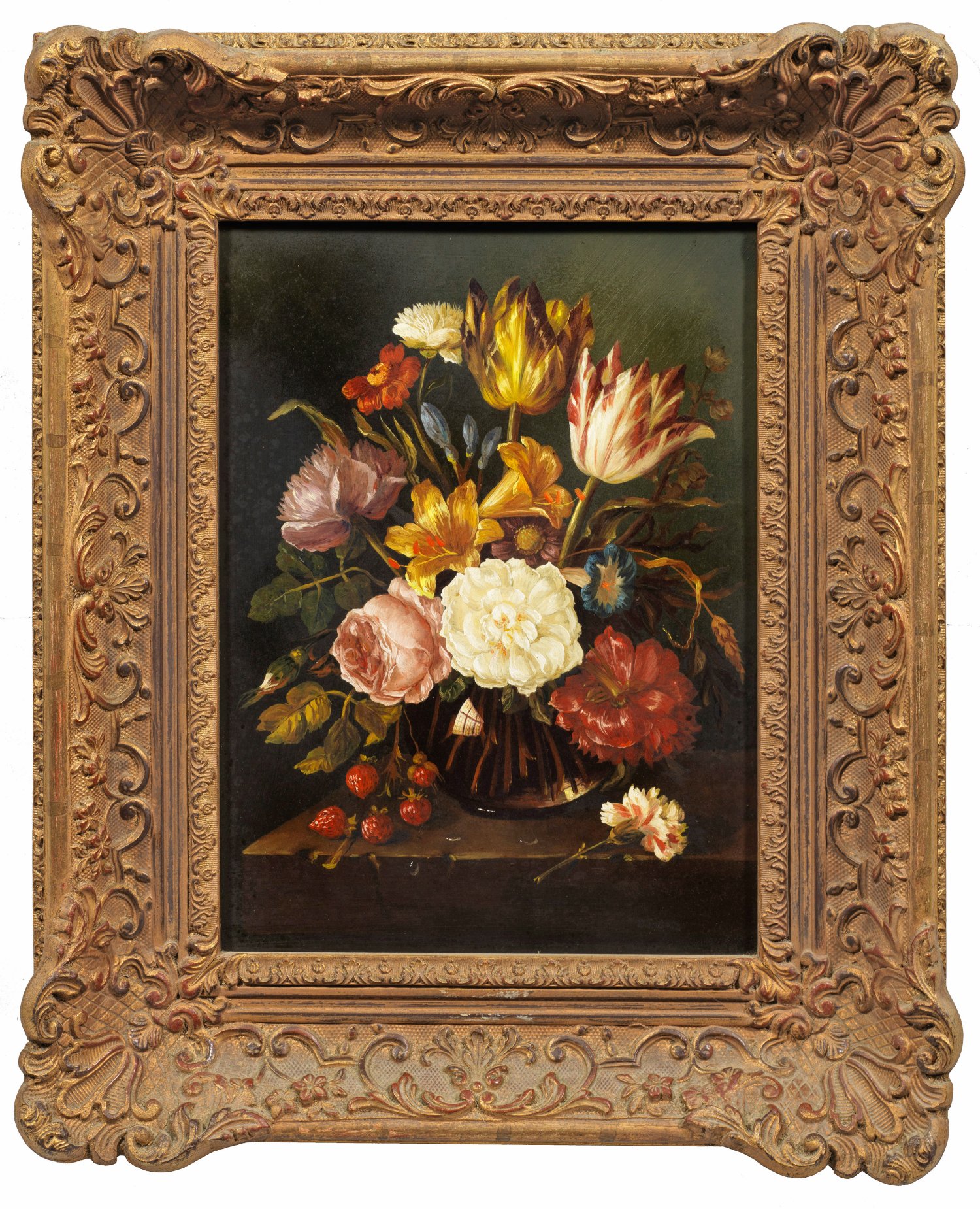 In der Manier der niederländischen Meister das fein ausgeführte, prächtige Blumenbouquet in klassischer Komposition mit dunklem Hintergrund auf einer Tischplatte. Öl/Holzplatte; R. u. sign. "Budenz". 39,7 cm x 30 cm. Rahmen.