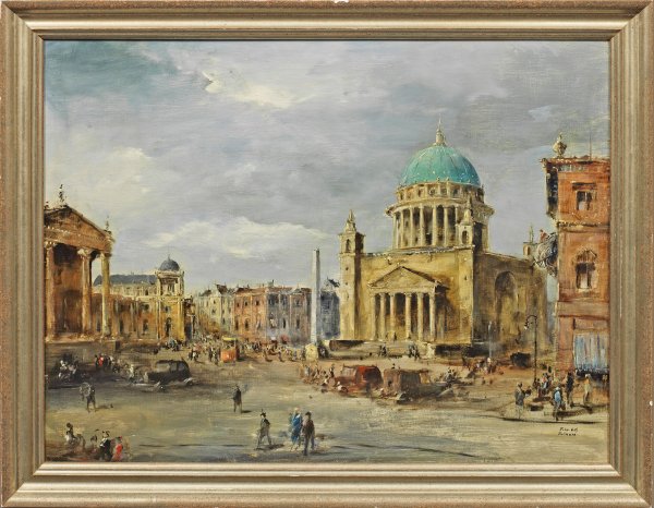 Nostalgischer Blick von Norden auf den Alten Markt in der Zwischenkriegszeit, wohl in den 1930er Jahren, reich belebt durch eine Staffage aus Figuren, Automobilen und Straßenbahn. Hauptmotiv ist die 1830-1850 errichtete St. Nikolaikirche im klassizistischen Stil, entstanden nach Plänen von Karl Friedrich Schinkel, vollendet durch Ludwig Persius Friedrich August Stüler; auf der rechten Seite das barocke Knobelsdorffhaus, gegenüber das Stadtschloss. Stiltypisches, in dezent tonigem Kolorit gemaltes Werk Pallmanns, der mit Vorliebe Ansichten von Berlin und Veduten vieler europäischer Metropolen wie Paris schuf. Diese spiegeln sein großes Interesse an der Atmosphäre, der Architektur und des Lebens in den einzelnen Städten wider. Öl/Sperrholztafel. R. u. sign.; 60 cm x 80 cm. Rahmen.