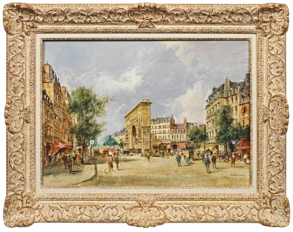 Nostalgische Darstellung mit einem Motiv aus der Zwischenkriegszeit in den 1930er Jahren. Für Pallmann, der häufig Ansichten europäischer Metropolen wie Paris schuf, charakteristische spätimpressionistische Vedute, bei der er subtil eine morgendliche, sommerliche Stimmung wiedergibt. Das Licht, die Atmosphäre und das pulsierende Leben in Paris faszinierten Pallmann, der vielfältige Ansichten der Straßen und Plätze schuf, Veduten von Notre Dame und der Seine, aber auch nächtliche Impressionen der Champs-Elysées, des Louvre und des Bois de Boulogne malte. Öl/Hartfaser. R. u. sign.; 45 cm x 65 cm. Rahmen.