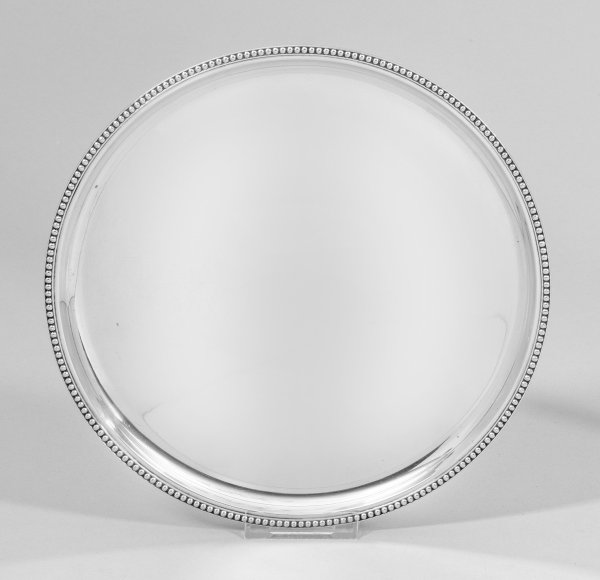 Silber. Runde Form. Gemuldeter, elegant glatter Spiegel, übergehend in ansteigende, kurze Fahne, mit Perlfries umzogener Rand. Unterseite mit gravierter Widmung und Dat. "9.9.1968". Minim. Gebrauchsspuren. Gest. 835, Herstellerzeichen. Gew. ca. 385 g. D. 26,5 cm.