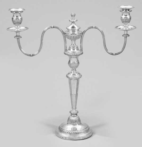 Silber, beschwert. 1- bzw. 3-flg.; Trompetenförmiger Stand, übergehend in konischen Balusterschaft. Herausnehmbarer Einsatz mit zwei stark geschwungenen, von Kanneluren gegliederten Leuchterarmen in breiten Traufschalen mit vasenförmigen Tüllen und in weiteren, herausnehmbaren Traufschalen endend. Zentrale Bekrönung mit einer stilisierten Vase und spitz zulaufendem Deckel mit blütenförmigem Nodus und Kugelknauf. Stand und Schaft umzogen von godronierten Bändern sowie einem Fries aus Eichenblättern. Gest., Beschauzeichen, Meister Andreas Sperl (tätig um 1825). Gew. ca. 1370 g. H. 49 cm.