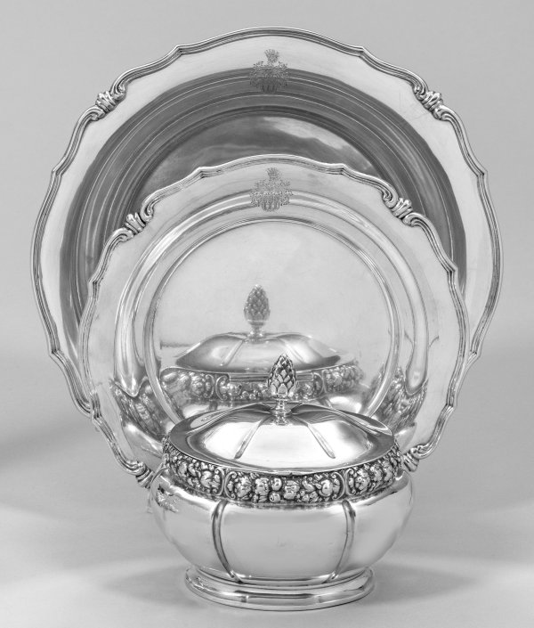 Silber. Zwei Wappenteller und eine Zuckerdose. Die Teller mit volutiertem Rand und graviertem Wappen mit drei Bäumen auf der Fahne. Die Zuckerdose mit üppigem Früchterelief und vollplastischem Pinienzapfen als Knauf. Innen vergoldet. Gest. 800, Herstellerzeichen, teilw. Händlermarke. Gew. zus. ca. 1110 g. H. 14 cm. D. 22 cm - 27,5 cm.