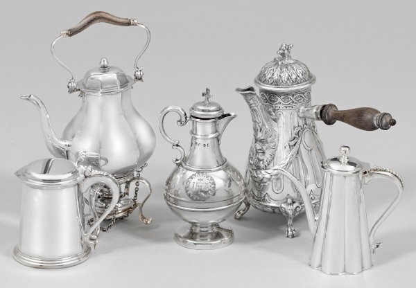 Silber. Zwei Kaffeekannen, eine Heißwasserkanne mit Rechaud, eine Weihwasserkanne sowie ein Deckelhumpen. Zwei Kannen mit Holzgriff bzw. -henkel. Teilw. gest. 800, Beschauzeichen, Herstellerzeichen, Jahresbuchstabe. Gew. zus. ca. 530 g. H. 7 cm - 13,5 cm.