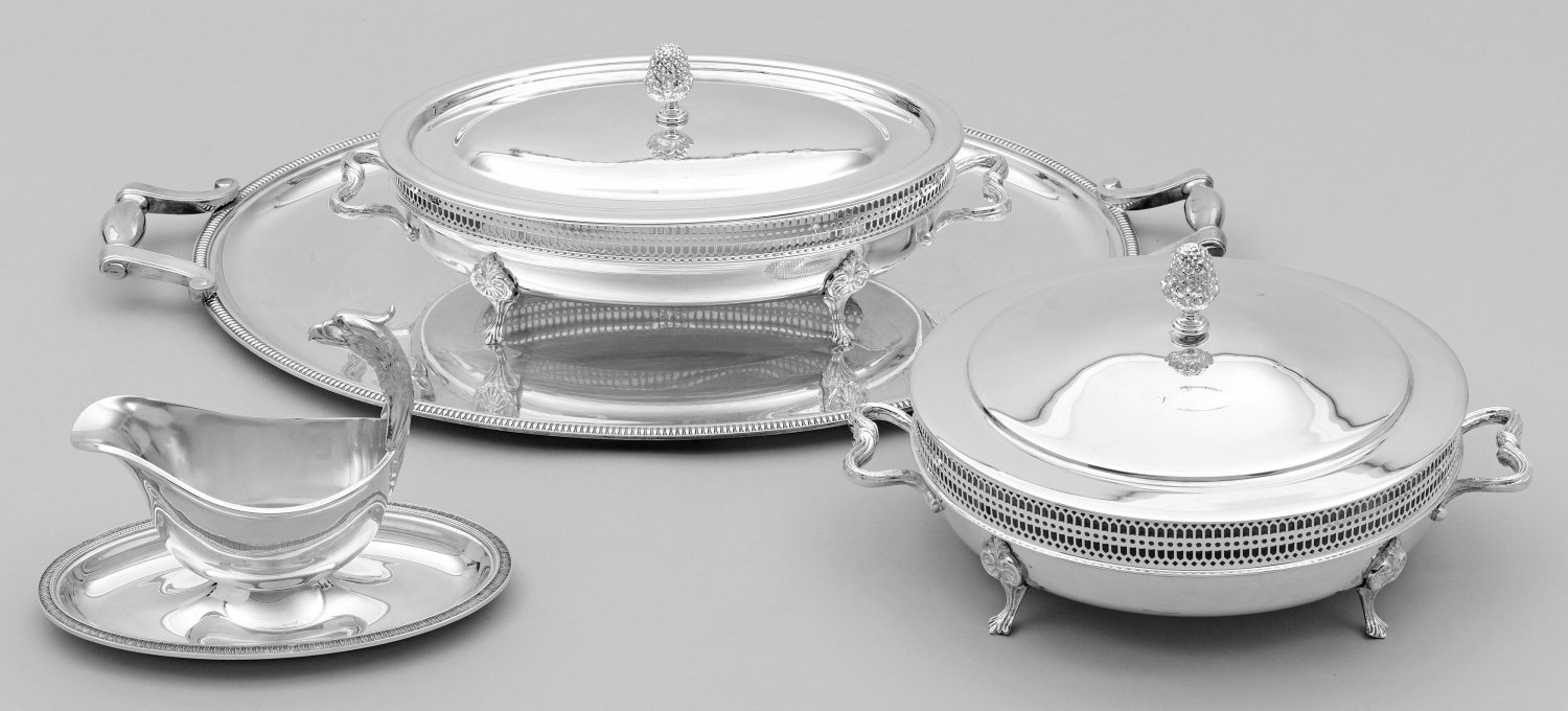 Plated und Glas. 4-tlg.; Ovales Henkeltablett, eine runde und eine ovale Deckelterrine mit Glaseinsätzen und eine Sauciere. U. a. stabfriesähnlich durchbrochen gearbeitete Wandung, vollplastischer Knauf in Form eines Pinienzapfens, Handhabe in Gestalt eines Adlerkopfes sowie Zierbänder aus Lorbeerblättern. Tabletthenkel besch.; Gem. "Coll. Gallia", Herstellerzeichen. H. 15,5 cm - 16,5 cm.