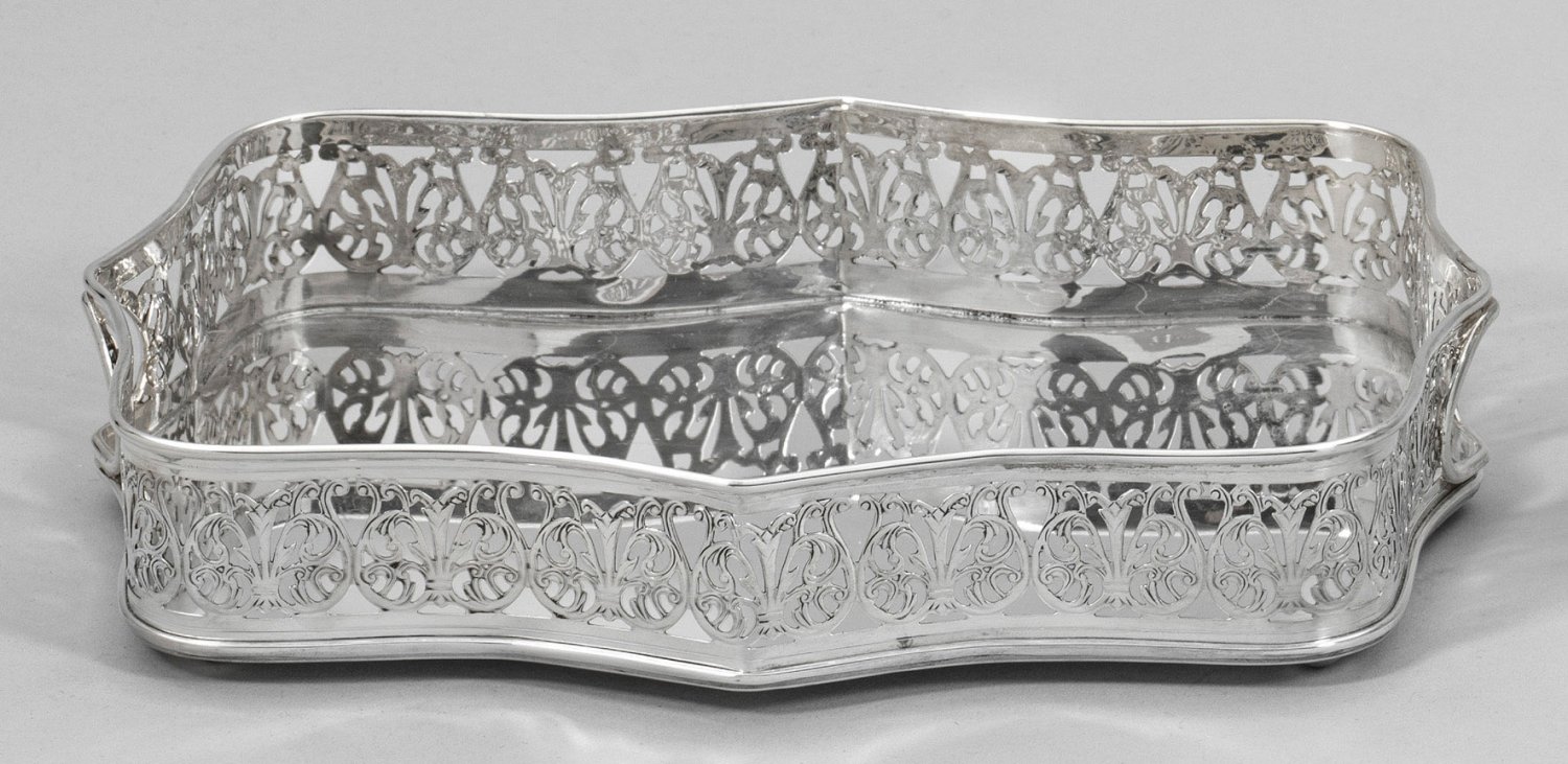 Silber. Passig geschweifte, glatte Bodenplatte, umzogen von volutiert durchbrochen gearbeitetem Rand. An den Schmalseiten kleine Griffmulden. Gest. 925, Herstellerzeichen. Gew. ca. 495 g. 26 cm x 20 cm.