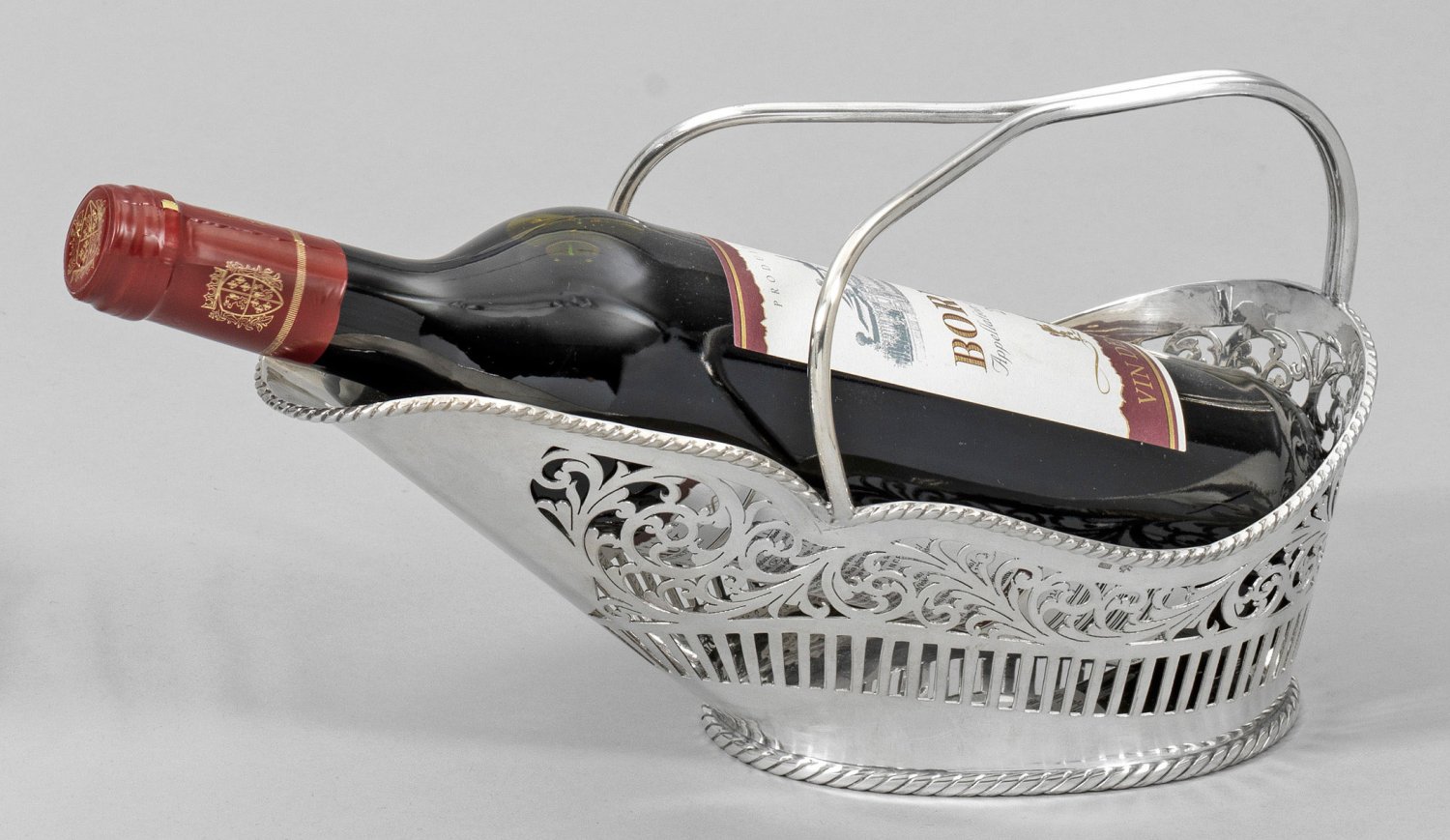 Silber. Dekorativ gestaltet in Form eines zweihenkeligen, ovoiden Korbes. Stab- und rankenförmig durchbrochen gearbeitete Wandung. Dazu eine Flasche Bordeaux, 2018. Gest. 800. Gew. ca. 560 g. H. 15 cm.