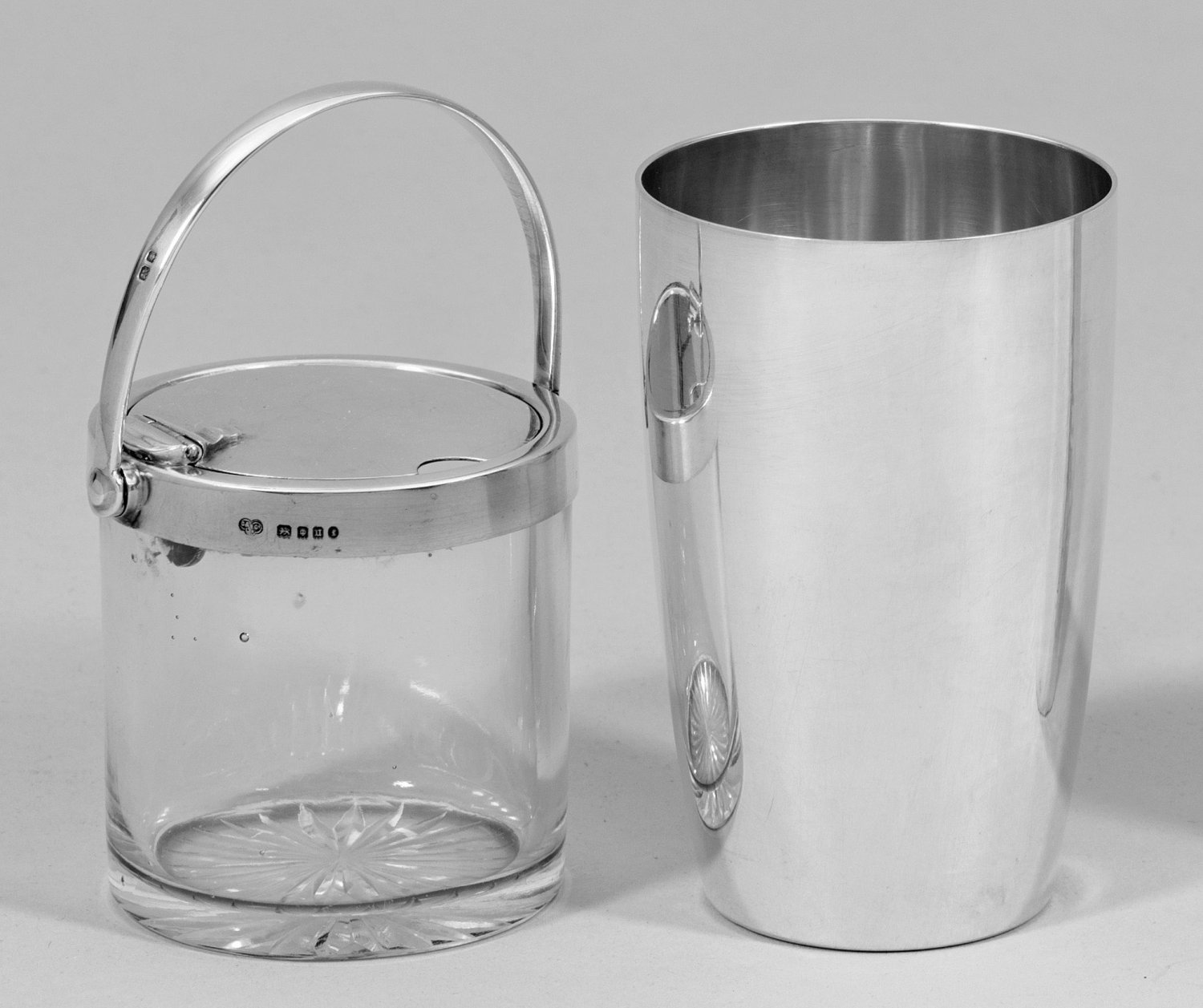 Silber und Glas. Eleganter, großer Becher mit glatter Wandung sowie kleiner Topf mit silbermontiertem, patentiertem, Scharnierdeckel und übergreifendem Bandhenkel. Patent-Nr. 5518. Gest. 835 sowie Beschau- und Herstellerzeichen. Becher-Gew. ca.115 g. H. 10,5 cm- 11,5 cm.