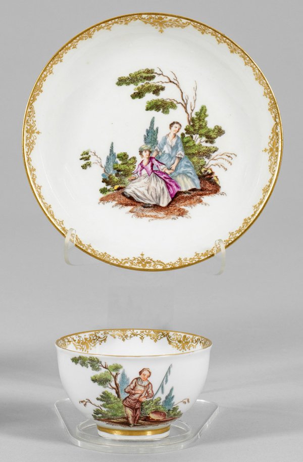A porcelain tea bowl and saucer finely painted with Watteau and theatrical figures from the Commedia dell'arte. Gold letter "S.". Partly former's mark for J. Chr. Schumann (active from 1735). Crossed swords mark.