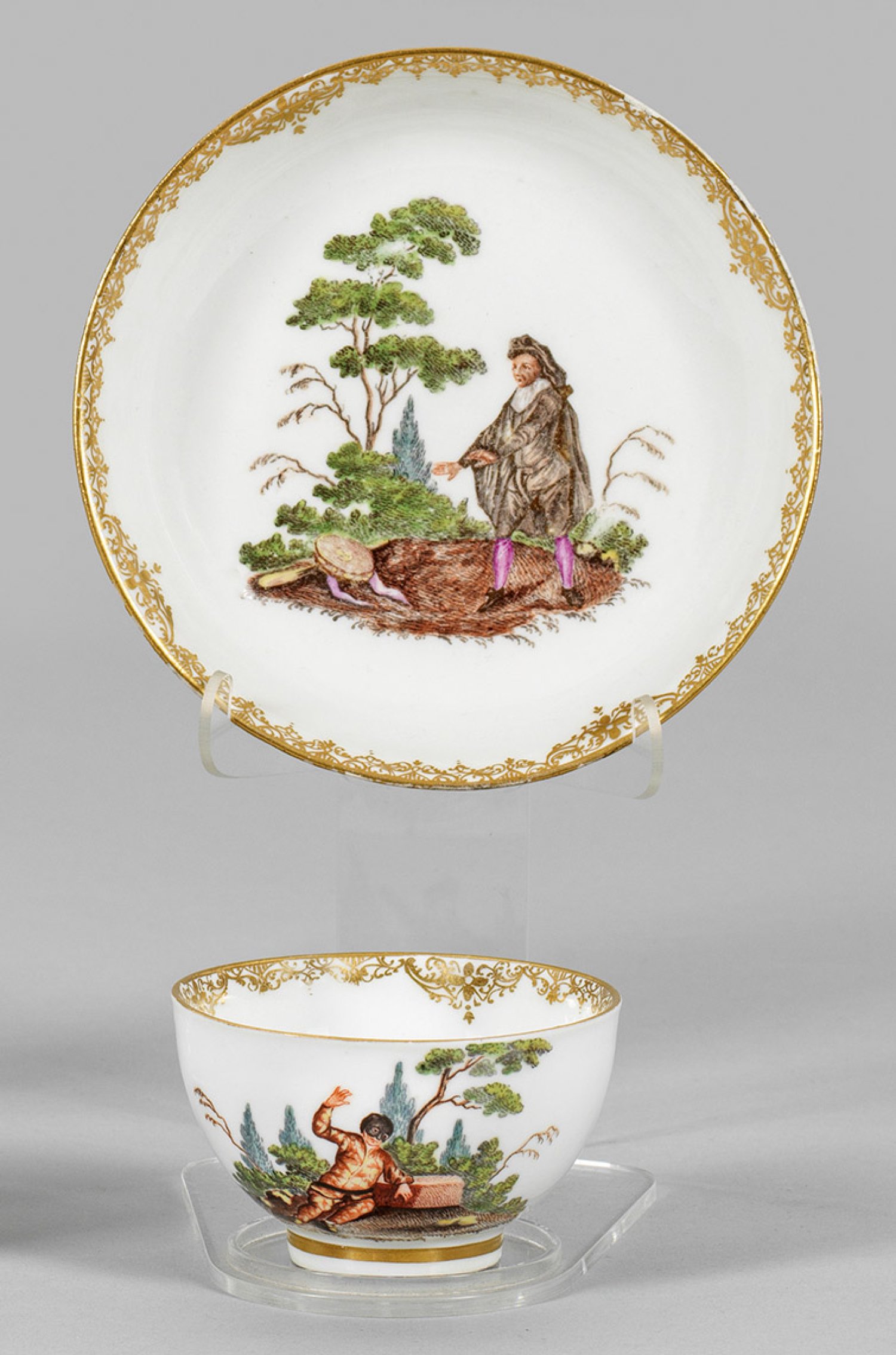 auf Untertasse. Halbkugeliger Korpus. Beidseitig der Wandung und im Spiegel Komödiantenfiguren aus der Italienischen Komödie in der Art von Watteauszenen. Dame mit Mandoline und Hund, Harlekin in rautengemustertem Anzug sowie Scaramuz unweit einer am Boden liegenden Pritsche und eines Tamburins. Im Spiegel des Koppchens farbiger Blütenzweig. Feine, polychrome Malerei. Umlaufende Goldspitzenbordüre. Goldbuchstabe "S.". Teilw. Dreher- und Formerzeichen für Johann Christoph Schumann (seit 1735 tätig). Schwertermarke. H. 4,5 cm.