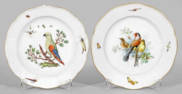 Runde, leicht vertiefte Form mit passig geschweiftem Goldrand. Reliefdekor "Altozier". Im Spiegel sitzende Vögel auf einem Ast, auf der Fahne vereinzelte Insekten und Schmetterlinge in polychromer Malerei. Schwertermarke. D. 24 cm -25 cm.