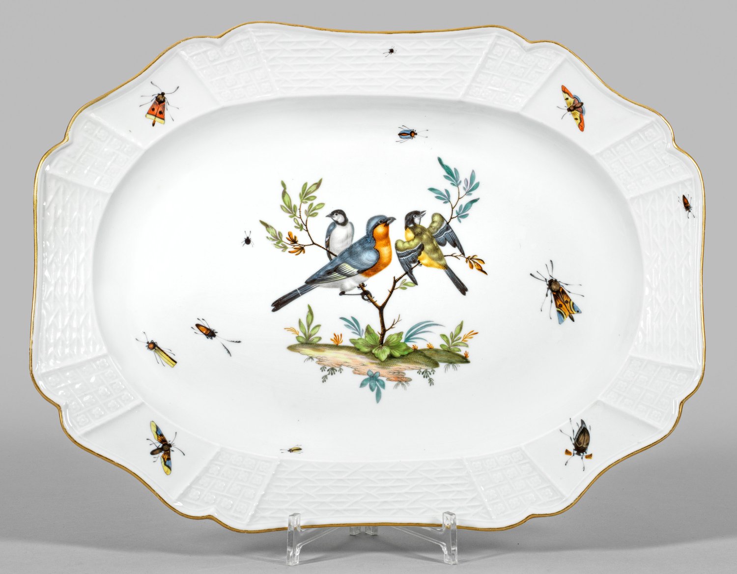 Ovale, gemuldete Form mit passig geschweiftem Goldrand. Reliefdekor "Altbrandenstein". Im Spiegel im Inselstil dargestellte, auf einem Baum sitzende heimische Vögel, umgeben von vereinzelten Insekten und Schmetterlingen in polychromer Malerei. Goldrand. Minim. rest.; Schwertermarke. 42 cm x 32 cm.