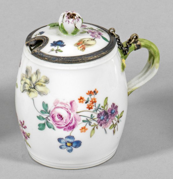 Fassförmiger, leicht gebauchter Korpus mit gewundenem Asthenkel. Silbermontierter, leicht gewölbter Deckel mit plastischem Blütenknauf. Feiner Manierblumendekor in polychromer Malerei. Schwertermarke. H. 9,5 cm.