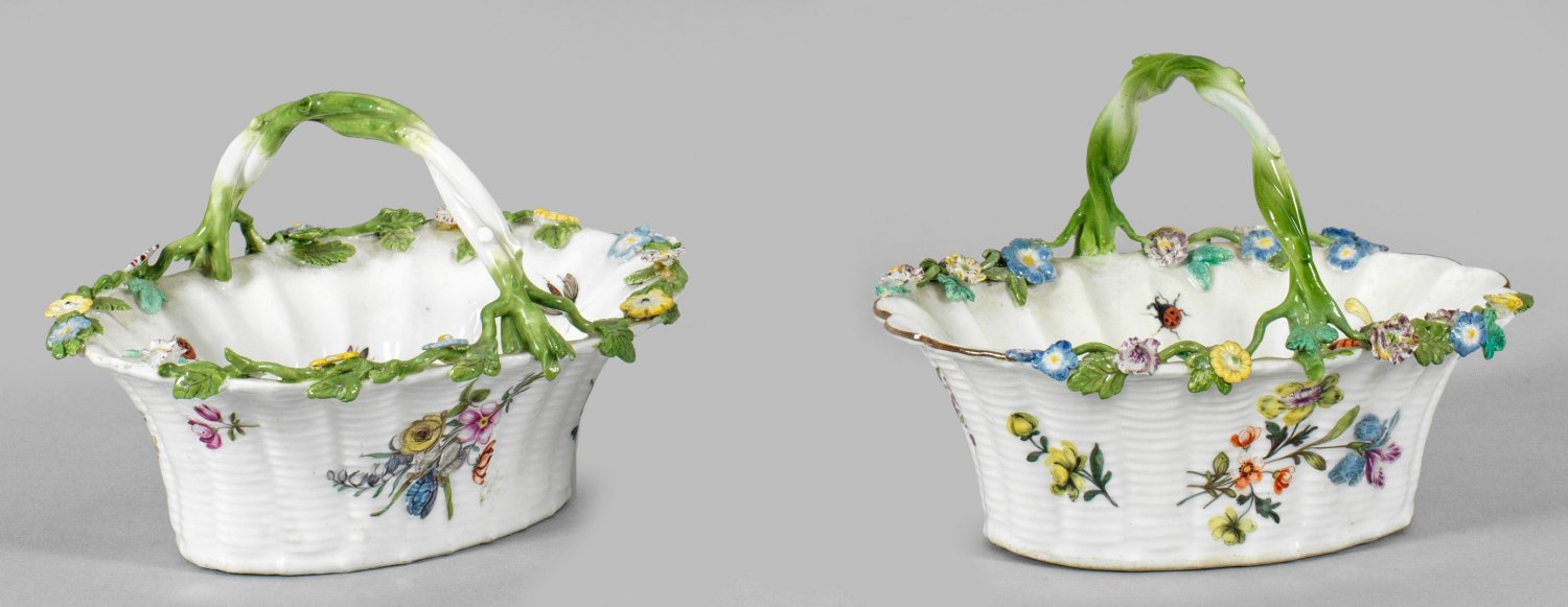 A pair of small handled porcelain baskets painted with flowers, butterflies and insects. Restored. Partly crossed swords mark.