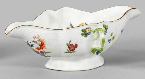 Navetteförmiger Korpus mit schnabelartig ausgezogenen Ausgüssen. Kapuzinerbrauner Rand. Seitlich blattreliefierte Ohrenhenkel. Reliefdekor "Altozier". Umlaufend farbenprächtiger Manierblumendekor in polychromer Malerei. Minim. best.; Schwertermarke. H. 7 cm. L. 22 cm.