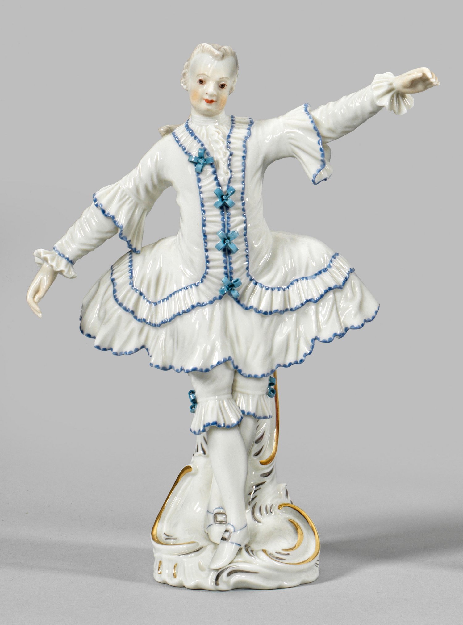 nach Alt-Frankenthaler Modell. Auf rundem Rocaillesockel in Tanzpose stehender Operntänzer in aufwendigem Kostüm. Sparsame polychrome Malerei mit Gold. Entw. Johann Friedrich Lück. Manufakturmarke. H. 21 cm.