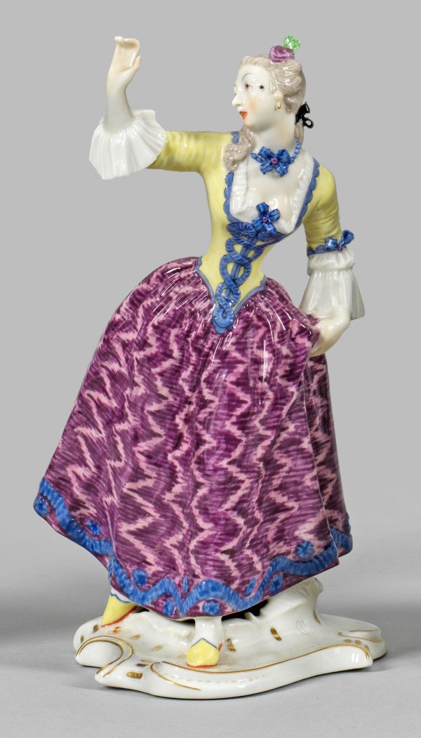 Auf geschweiftem Rocaillesockel stehende Leda in gelbem Mieder und langem Moire-Rock, ihren rechten Arm in Abwehrhaltung erhoben. Polychrome Malerei mit Goldstaffage. Entw. Franz Anton Bustelli, 1759/1760. Manufakturmarke. H. 18,5 cm.