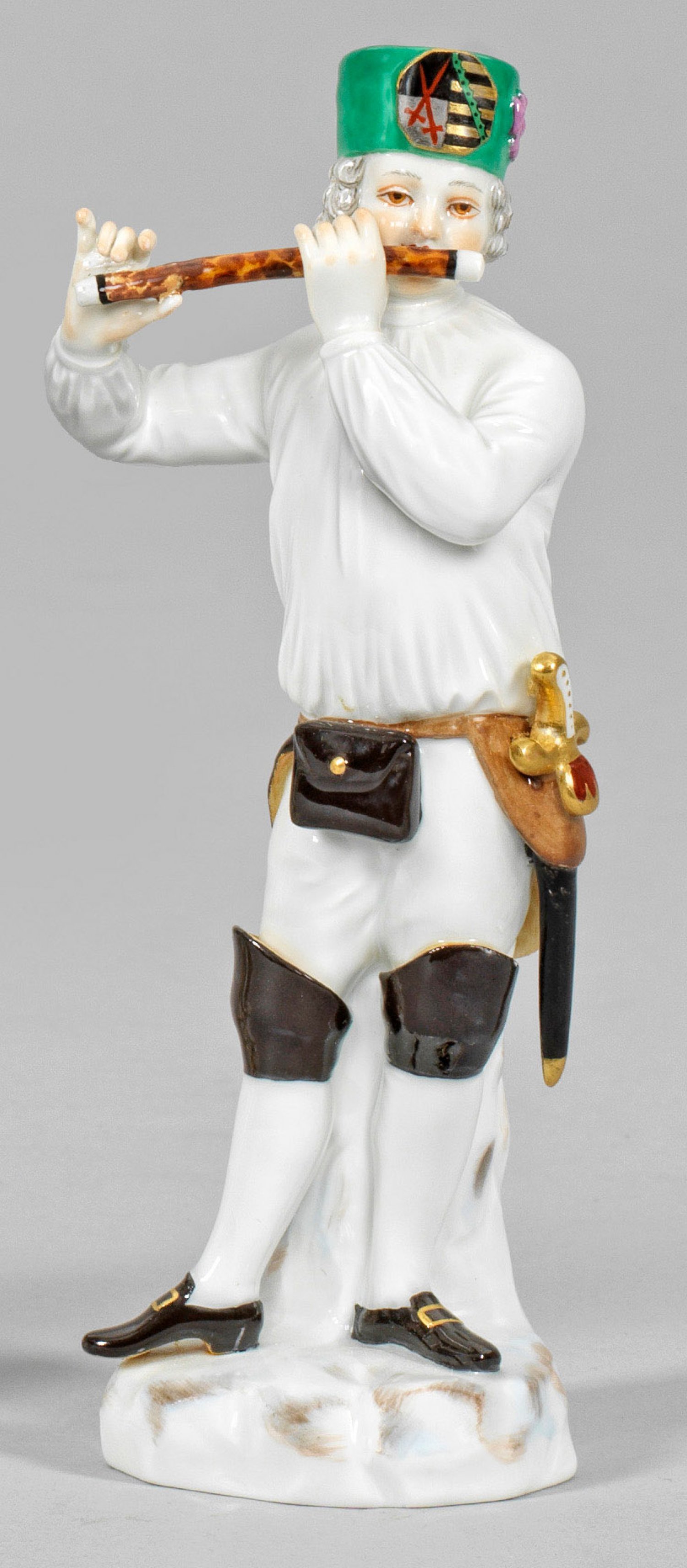 Auf rundem Felssockel stehender Bergmann mit Tscherpertasche, Bergmannskappe mit kurfürstlich-sächsischem Wappen, die Querflöte spielend. Polychrome Malerei. Entw. Ernst August Leuteritz. Modell-Nr. 69542. Minim. rest.; Schwertermarke. H. 16,5 cm.