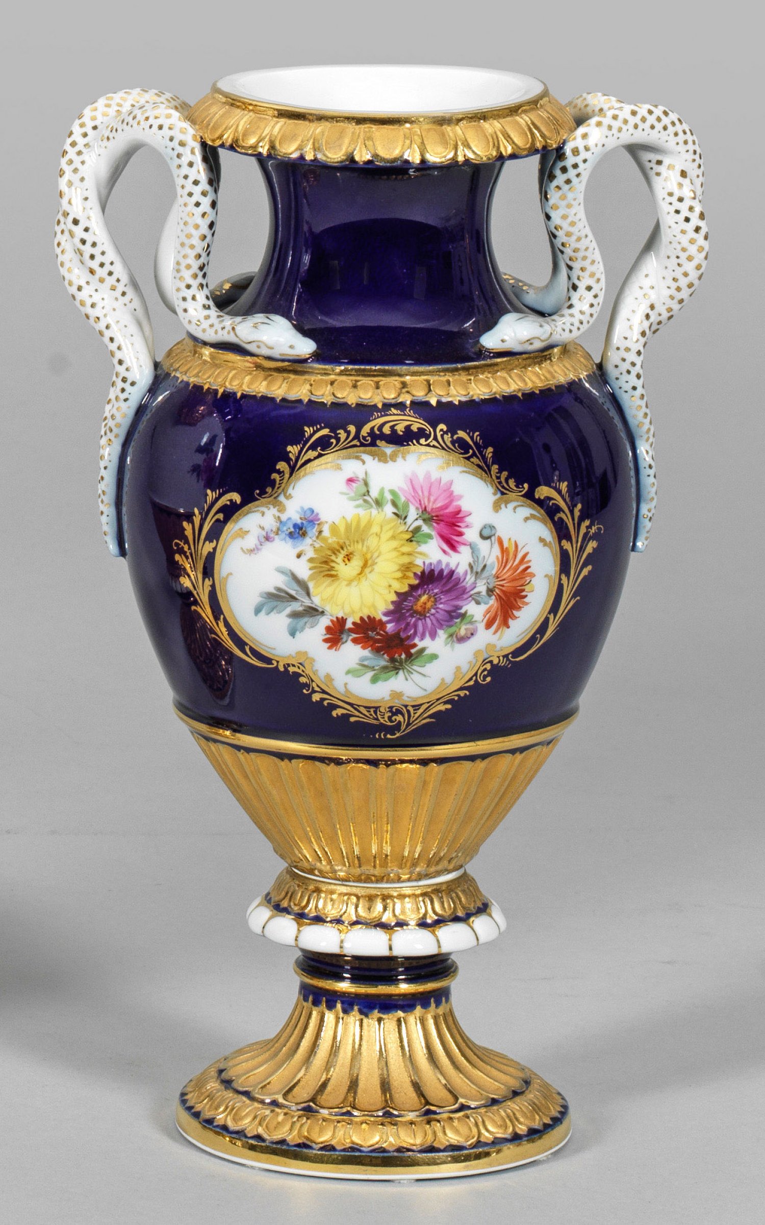 Amphorenförmiger Korpus, umzogen von vergoldeten, reliefierten Ornamentbordüren. Seitlich aufsteigende, gewundene Schlangenhenkel. Schauseitig in kobaltblauem Fond ausgesparte Goldrankenreserven mit farbenprächtigem Blumenarrangement. Schwertermarke. H. 27 cm